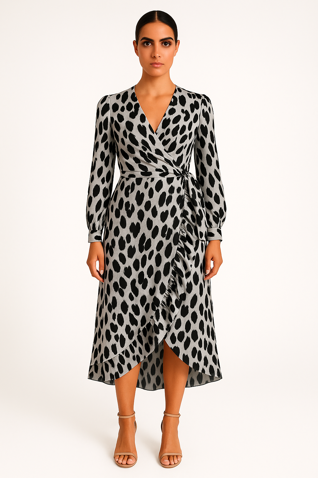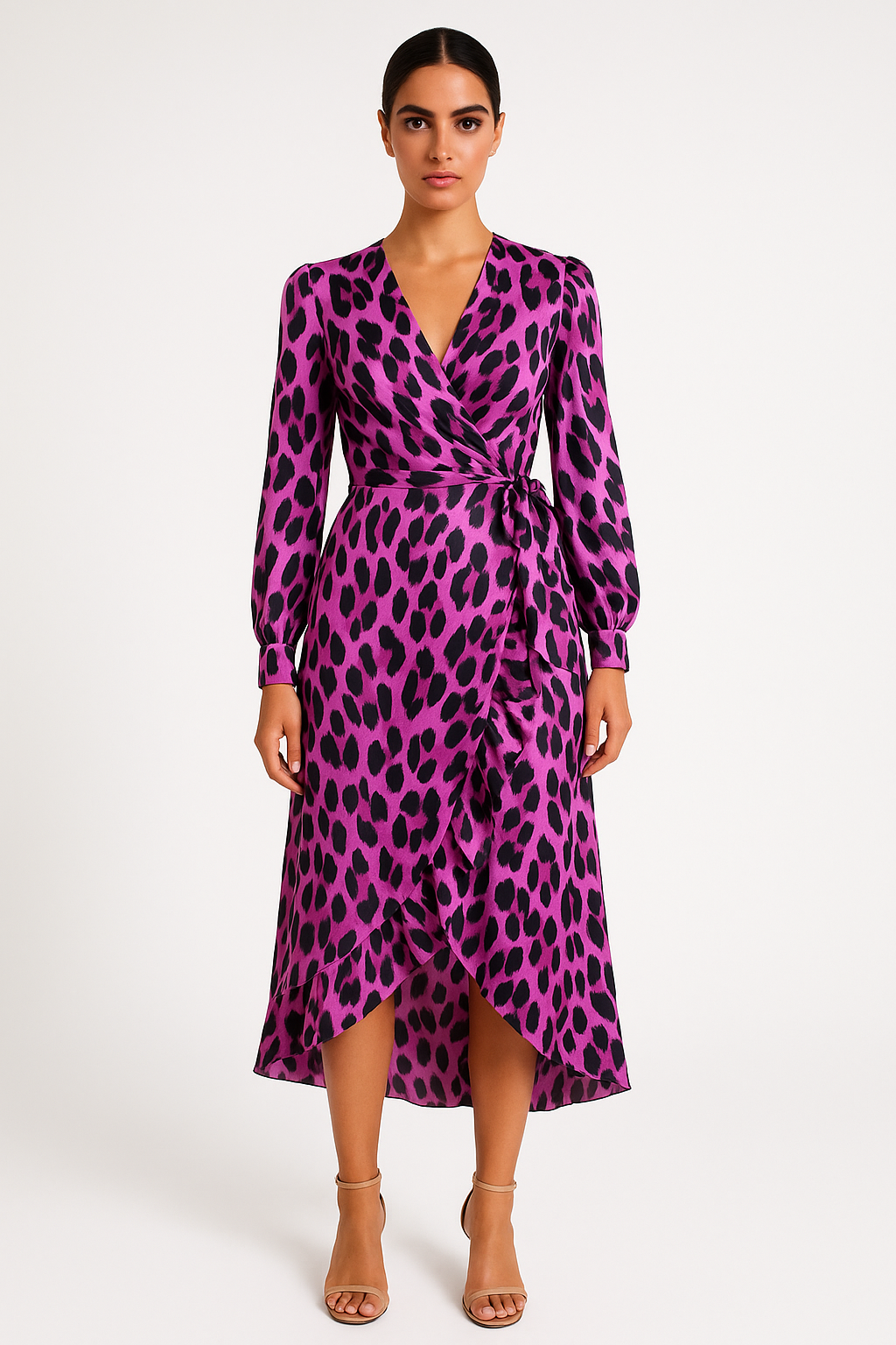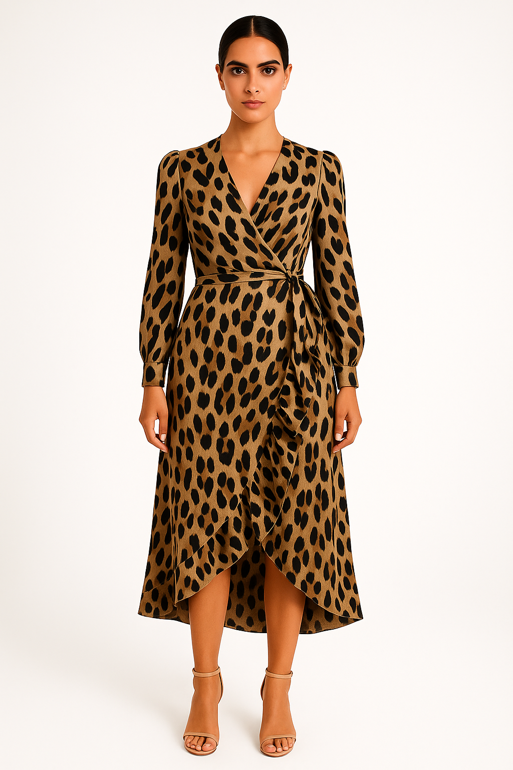 Questo abito midi con stampa animalier e scollo a V incrociato dona carattere e femminilità in un solo gesto.