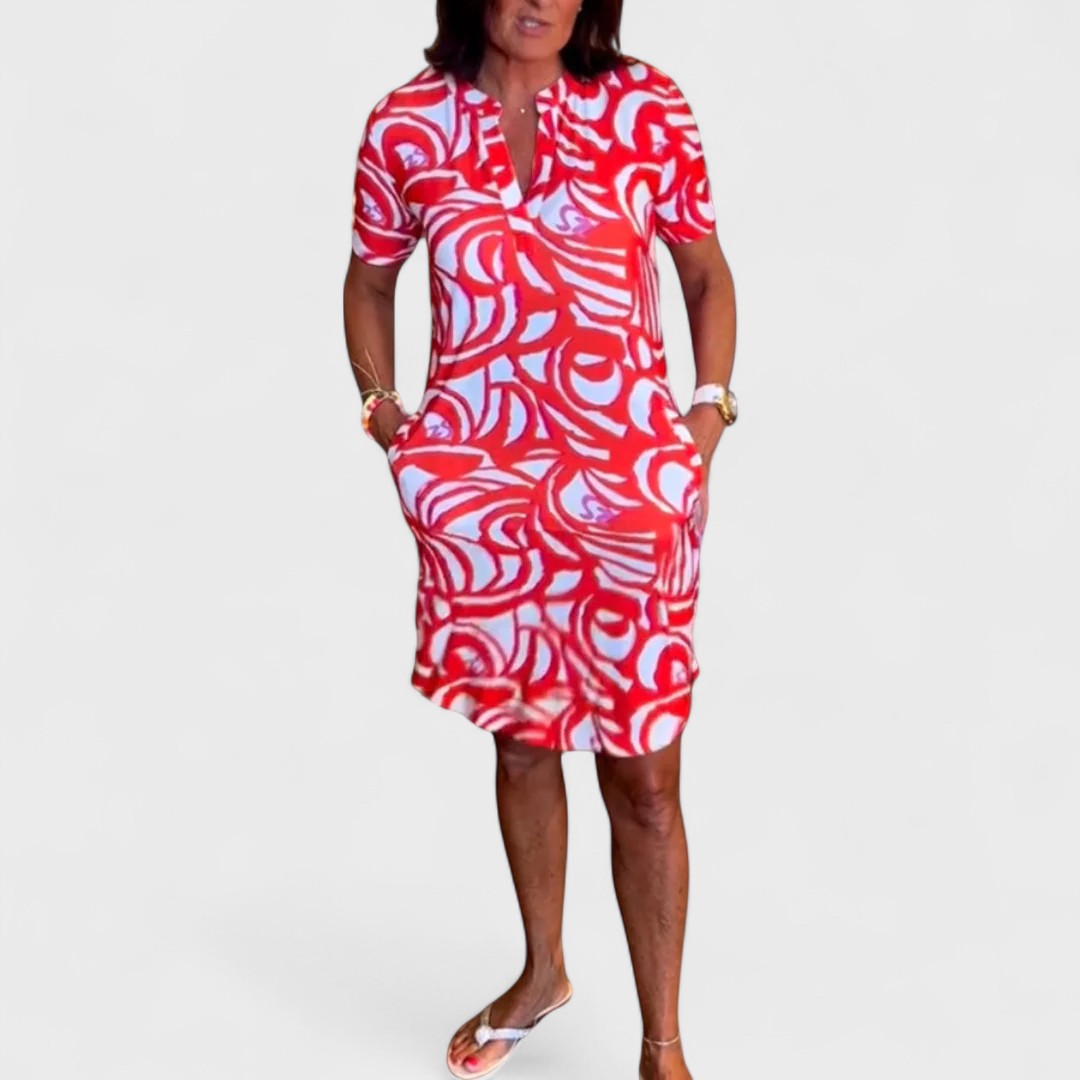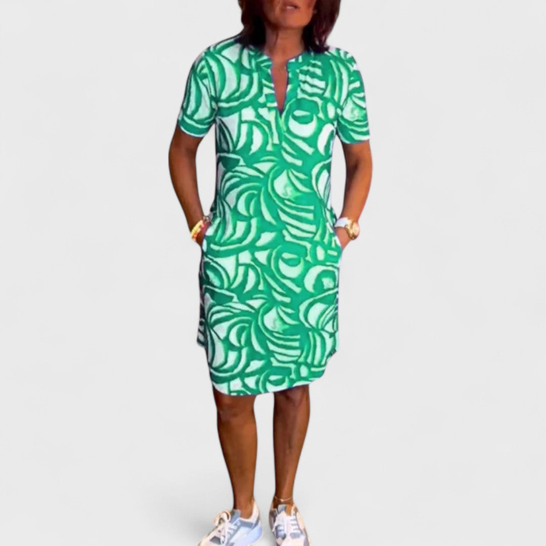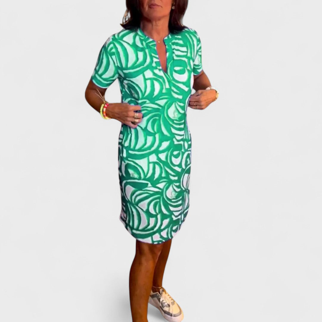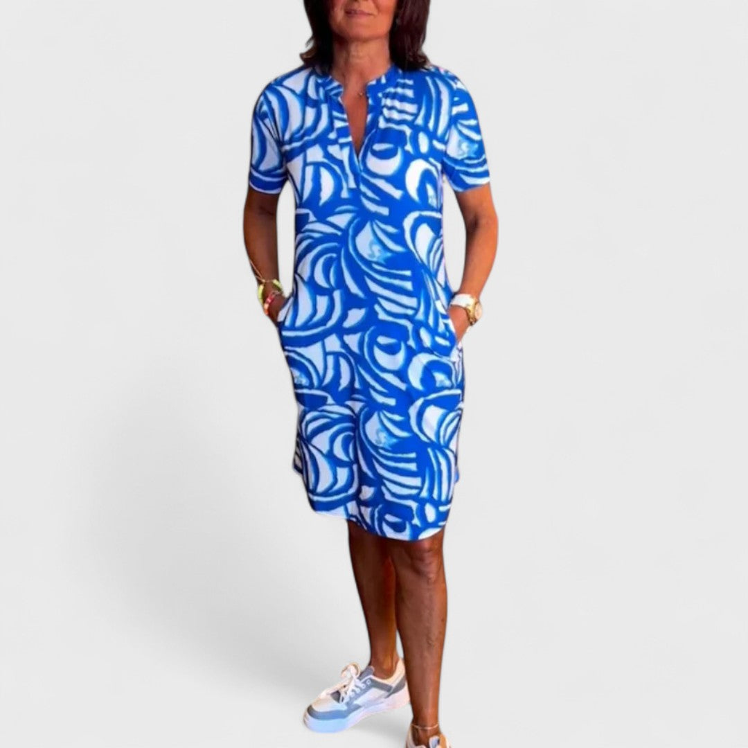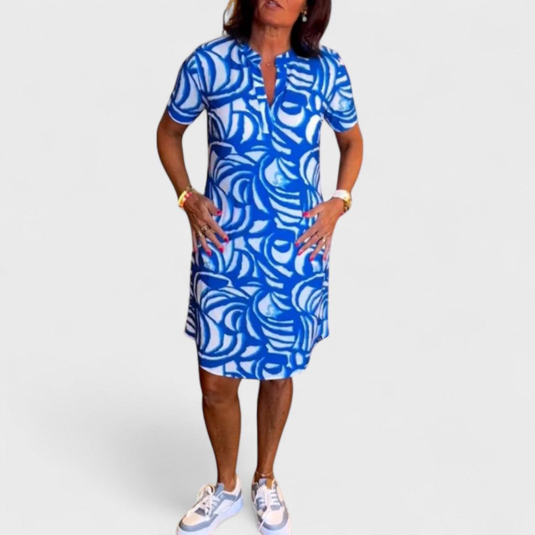 Questo abito corto con stampa astratta è la scelta perfetta per chi desidera comfort e colore in un look rilassato ma femminile.