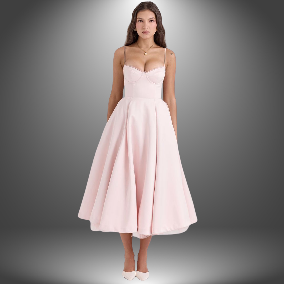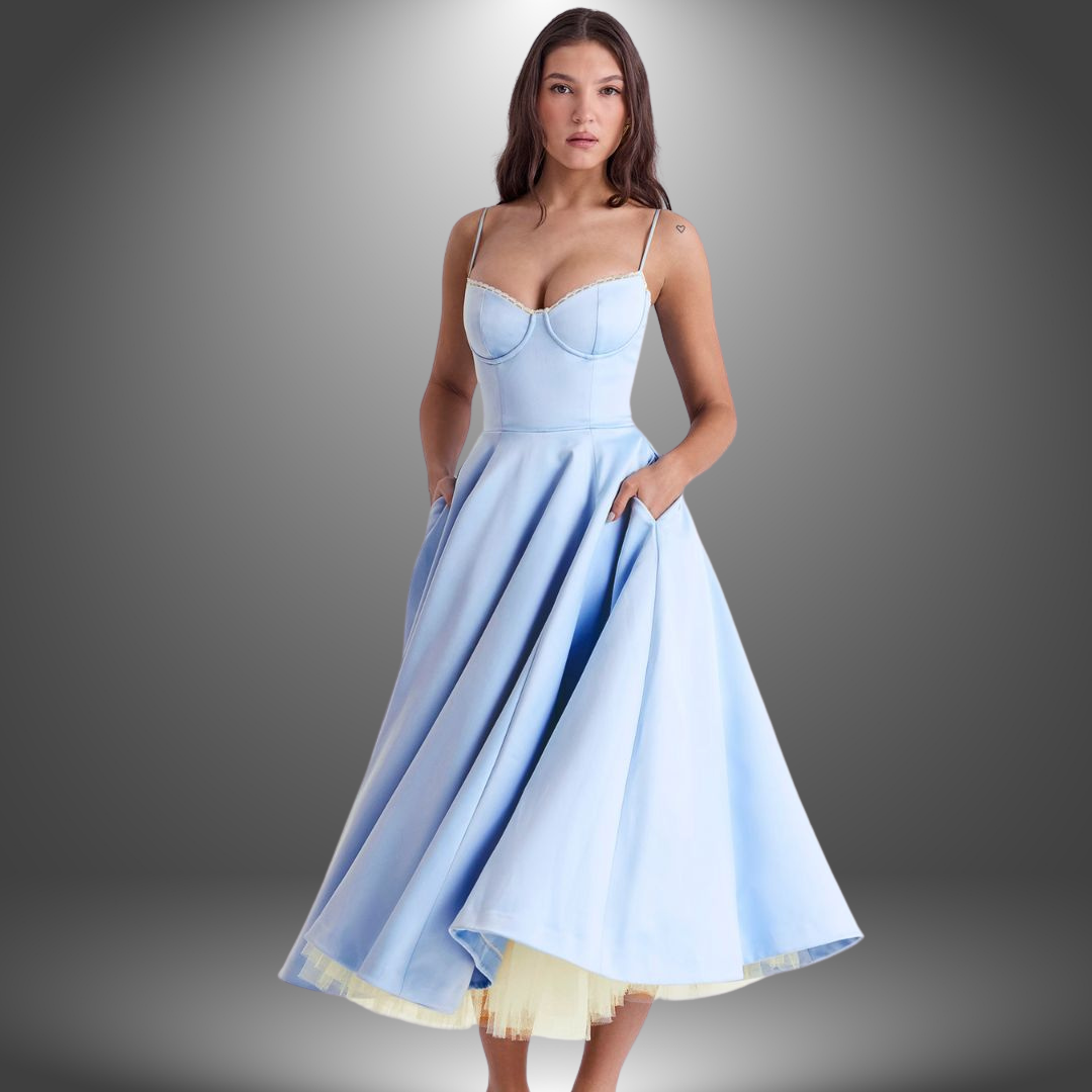 Questo abito midi azzurro con bustier e gonna ampia è un inno alla femminilità e allo stile rétro.