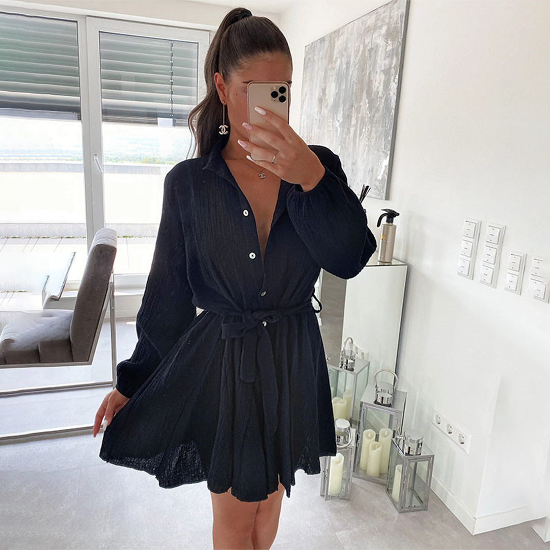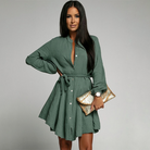 Questo abito camicia svasato presenta un design elegante con bottoni frontali, maniche lunghe e una cintura in vita per valorizzare la silhouette. Perfetto per il lavoro, brunch o uscite serali.
