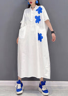 Questo abito chemisier oversize in cotone con applicazioni floreali blu è perfetto per esprimere la tua personalità in chiave street style.