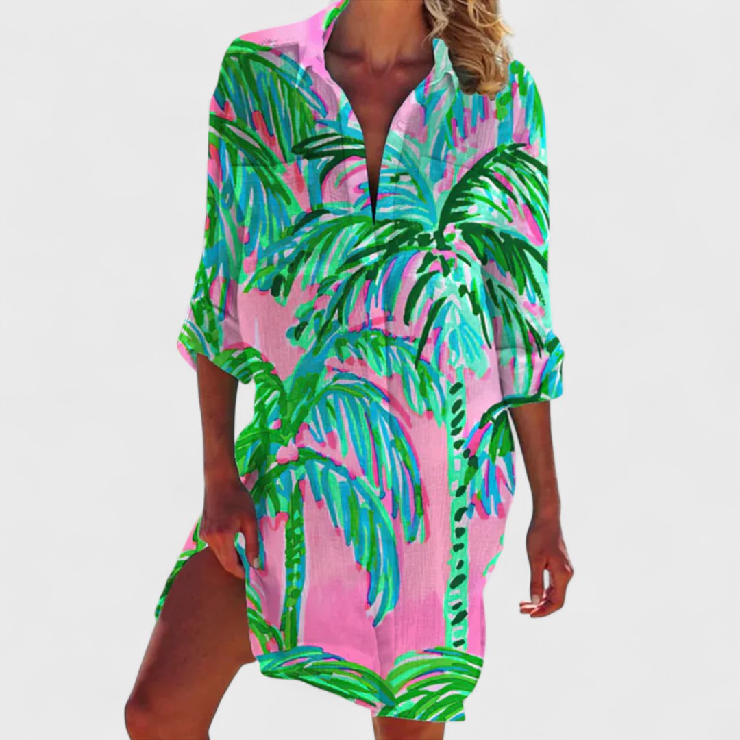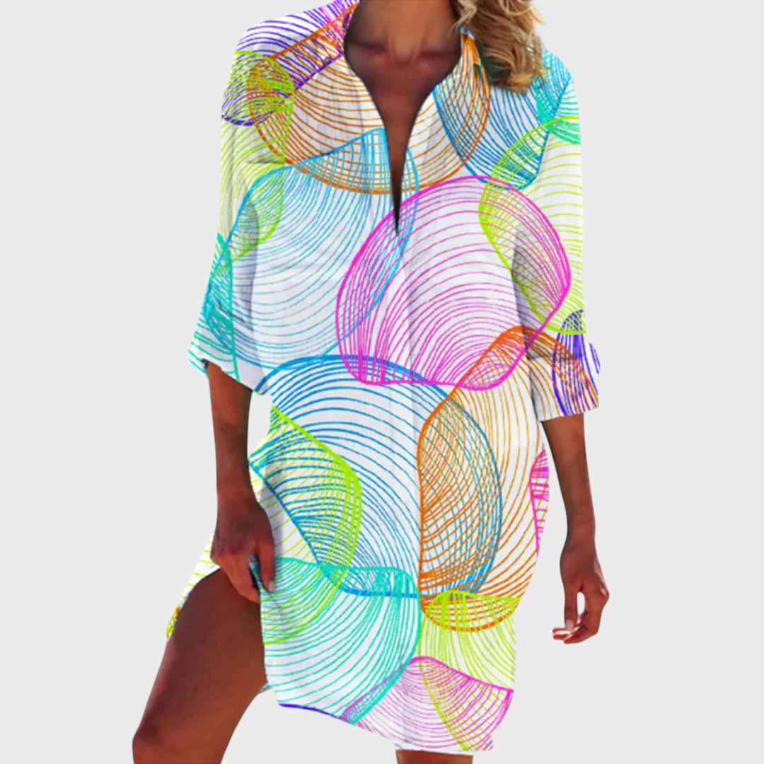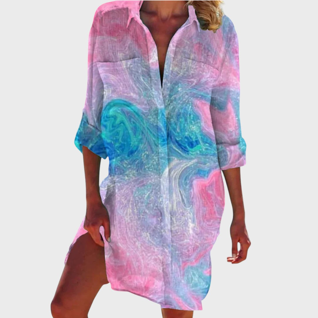 Questo abito chemisier con stampa tie-dye cattura l’energia dell’estate con i suoi colori sgargianti e il design rilassato.