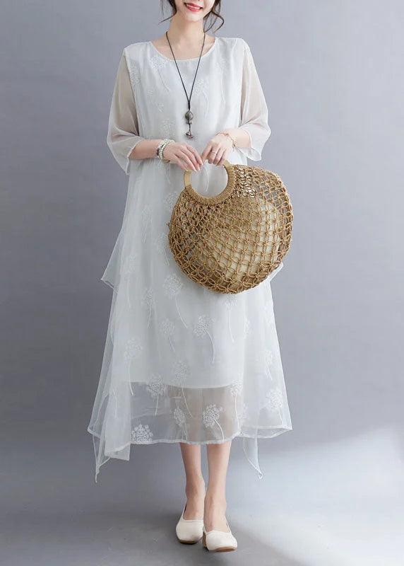 Questo abito lungo in chiffon trasmette un'eleganza delicata grazie ai suoi strati fluttuanti e alla trasparenza raffinata.