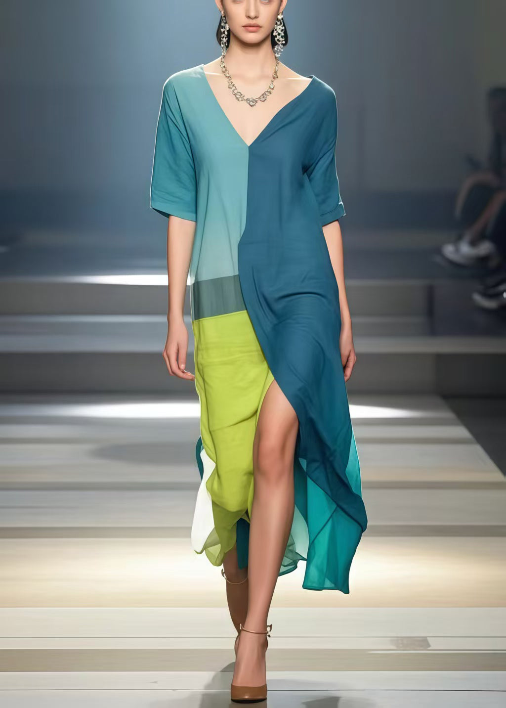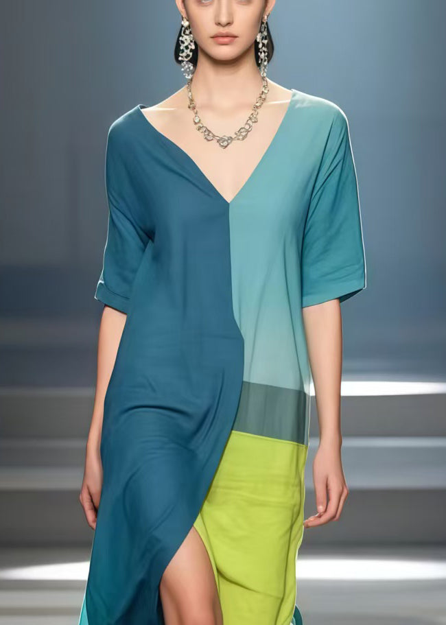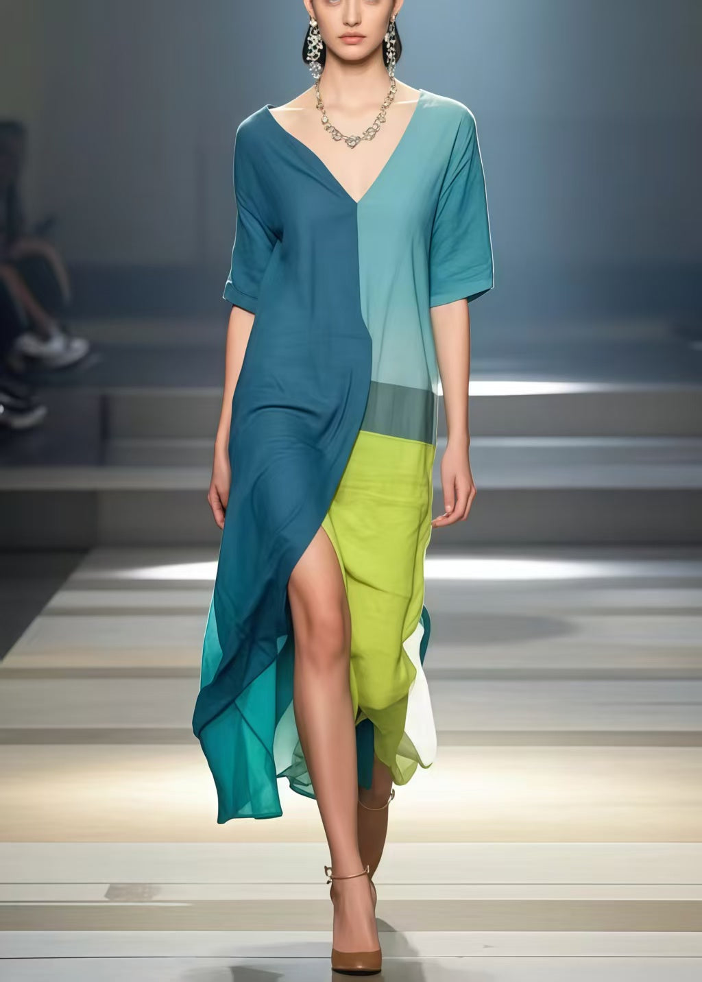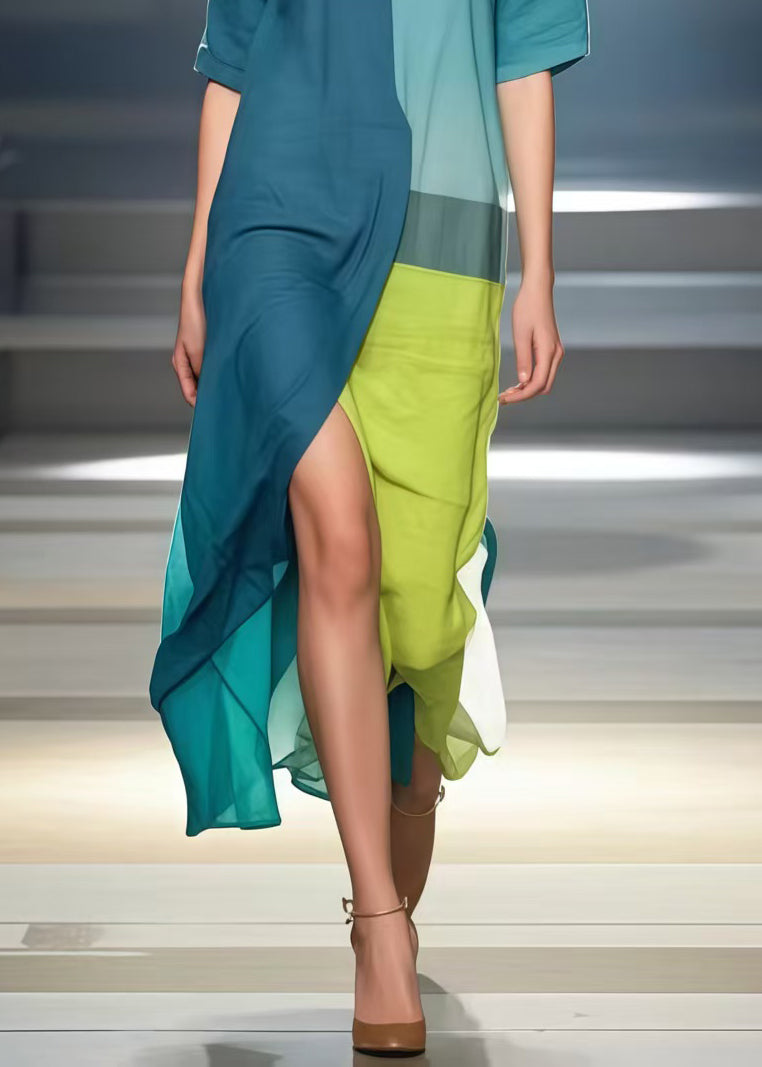 Il mix di tonalità fredde e accese, unito allo spacco frontale e al tessuto leggero, lo rende perfetto per distinguerti con stile.