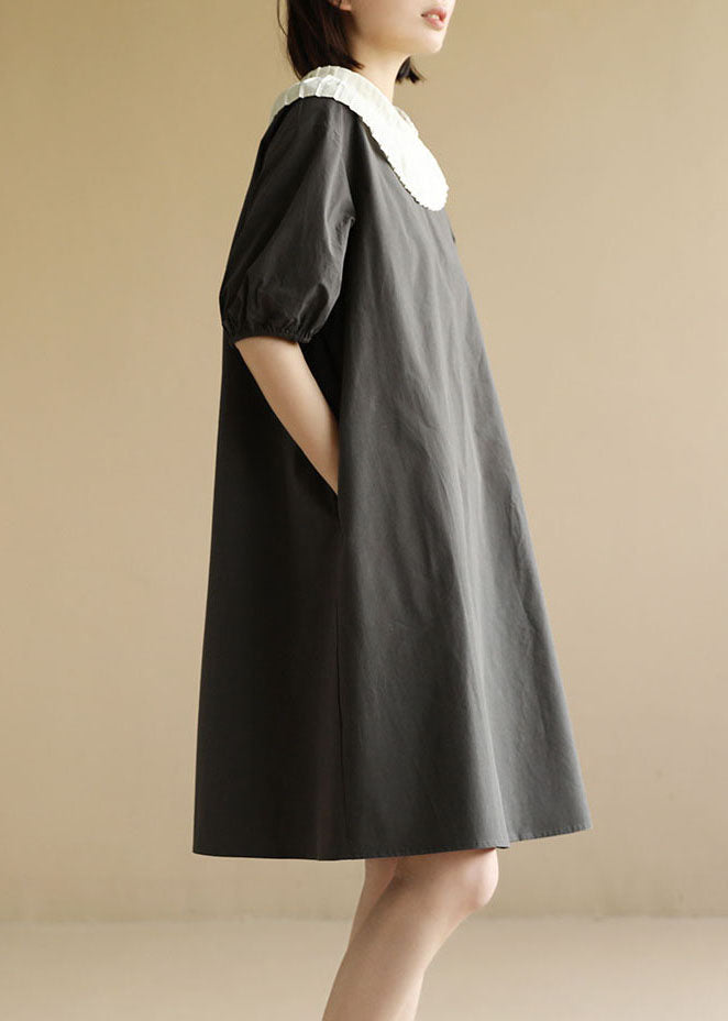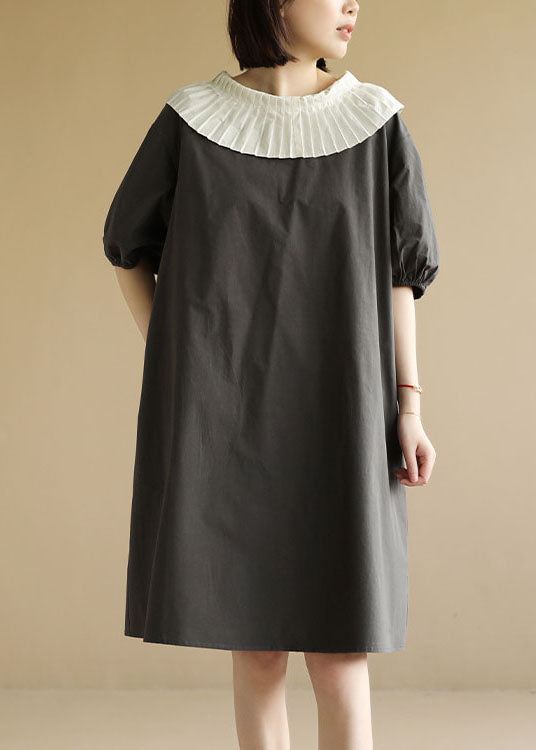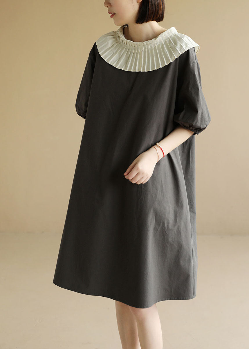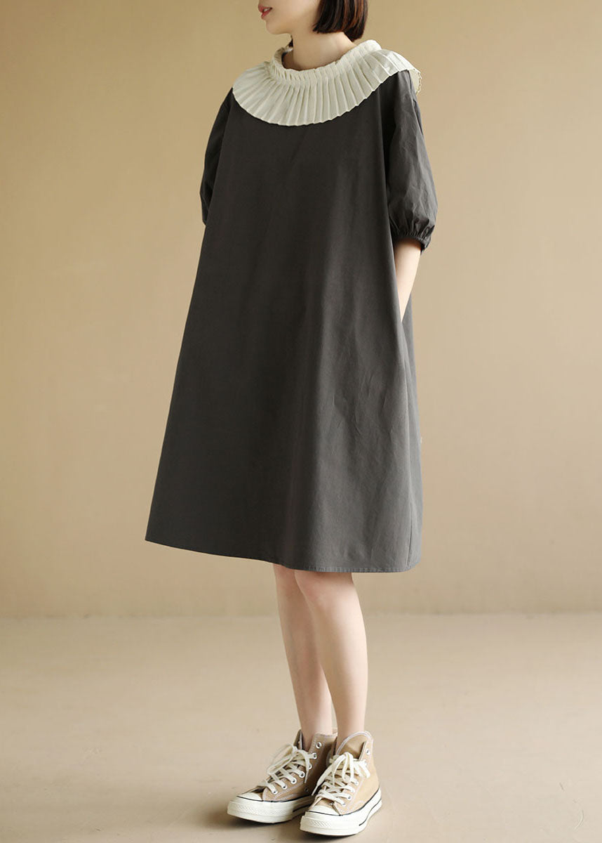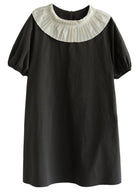 Questo abito in cotone dal taglio dritto si distingue per il suo grande colletto plissettato, perfetto per chi ama un tocco retrò.