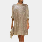 Questo abito corto con paillettes presenta una silhouette morbida con scollo a barca e maniche ampie, perfetto per un'eleganza senza sforzo. La cintura in vita aggiunge definizione, rendendolo ideale per feste ed eventi chic.