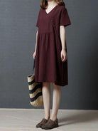 Questo vestito corto in cotone con scollo a V e chiusura laterale a bottoni unisce comfort e stile senza sforzo.