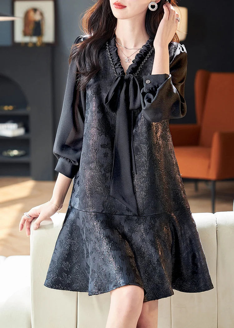 Questo abito corto con fiocco al collo e tessuto lucido dona un tocco sofisticato e femminile.