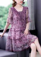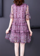 Questo abito corto in tulle ricamato con balze è un concentrato di femminilità e delicatezza.