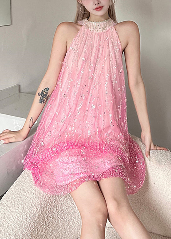 Questo abito corto rosa con paillettes e collo alto è perfetto per brillare con eleganza e personalità.