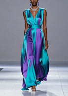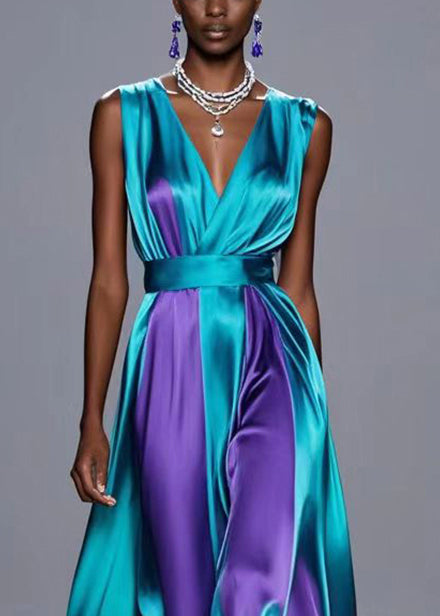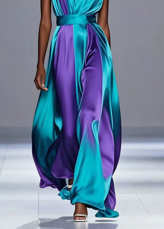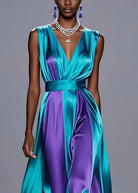 Questo abito lungo in raso con giochi di colore tra turchese e viola è puro fascino in movimento.
