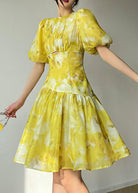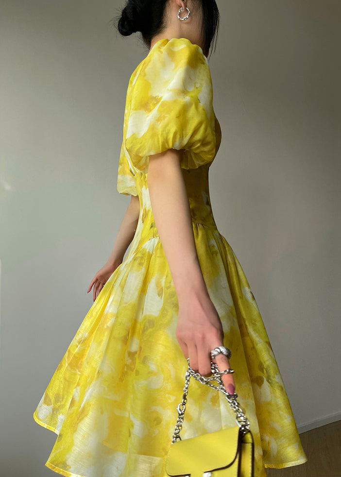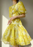 Il taglio sotto il seno con delicato cut-out e la stampa acquerello giallo lo rendono romantico ma moderno.