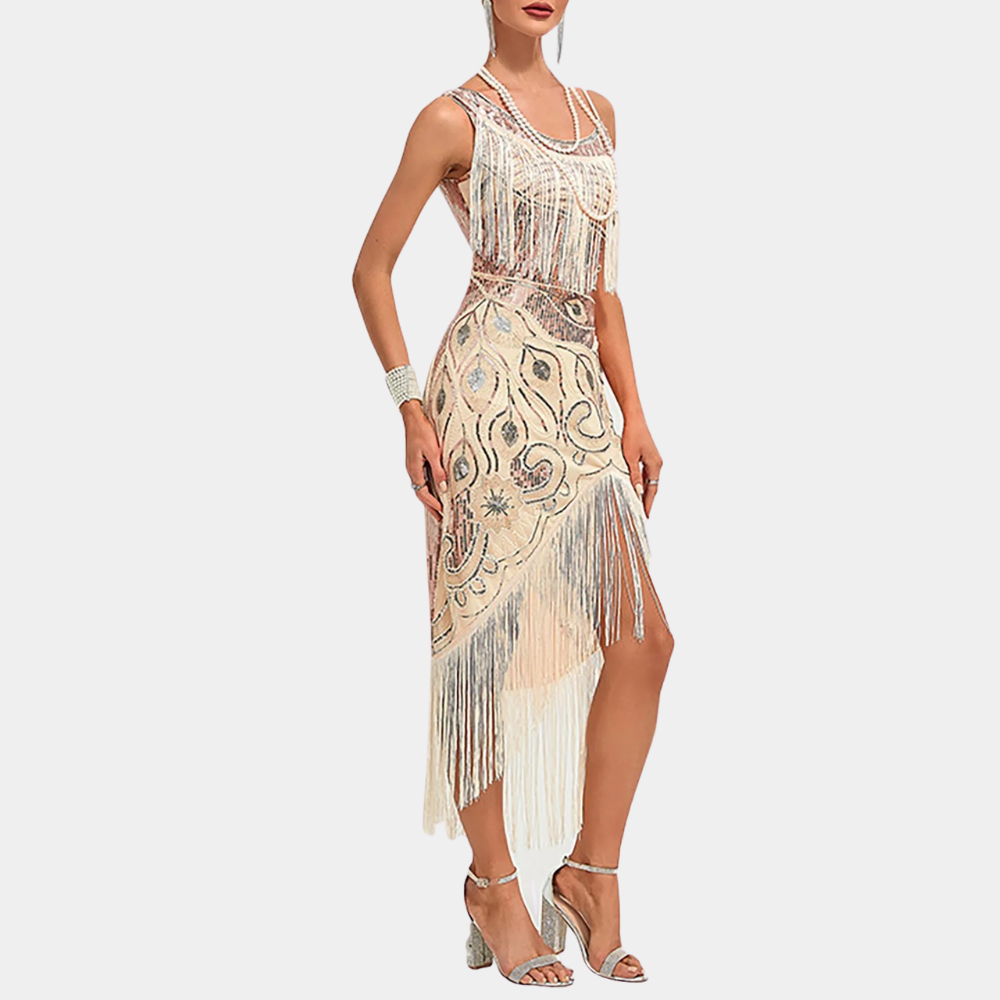 Questo abito con frange e dettagli ricamati è un omaggio allo stile glamour anni '20, perfetto per serate eleganti, feste a tema o eventi sofisticati. Il taglio asimmetrico e lo spacco laterale aggiungono movimento e sensualità a ogni passo.