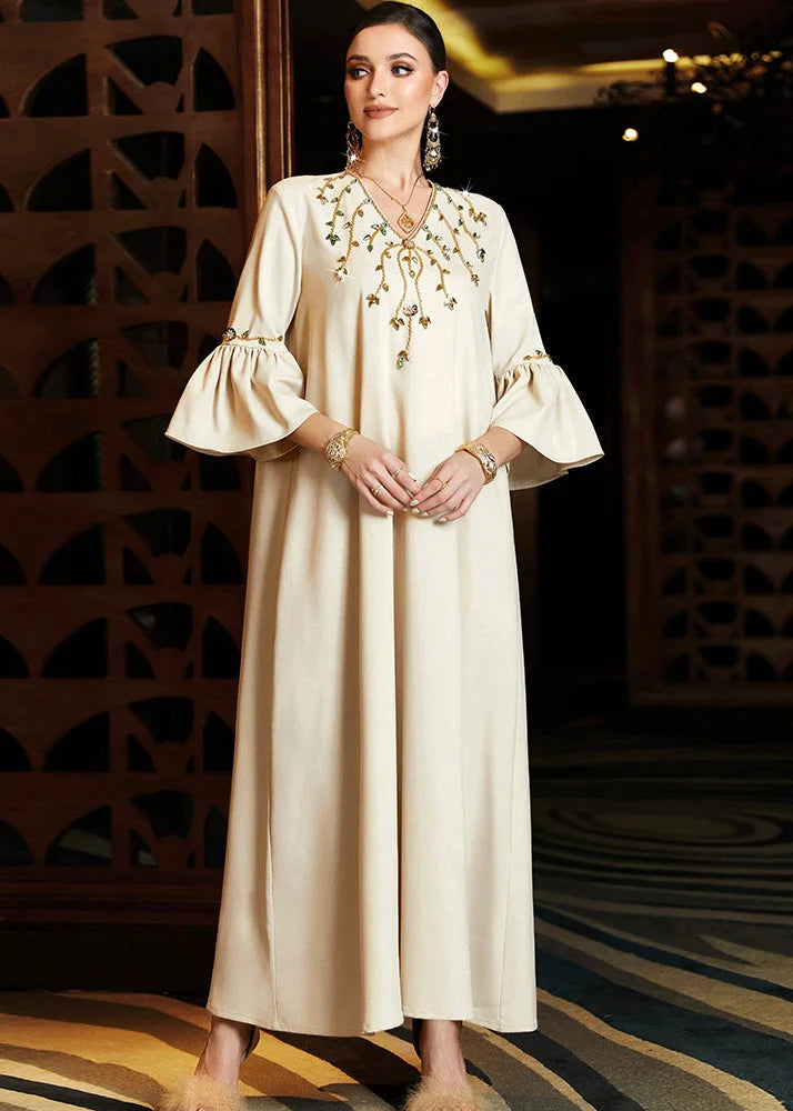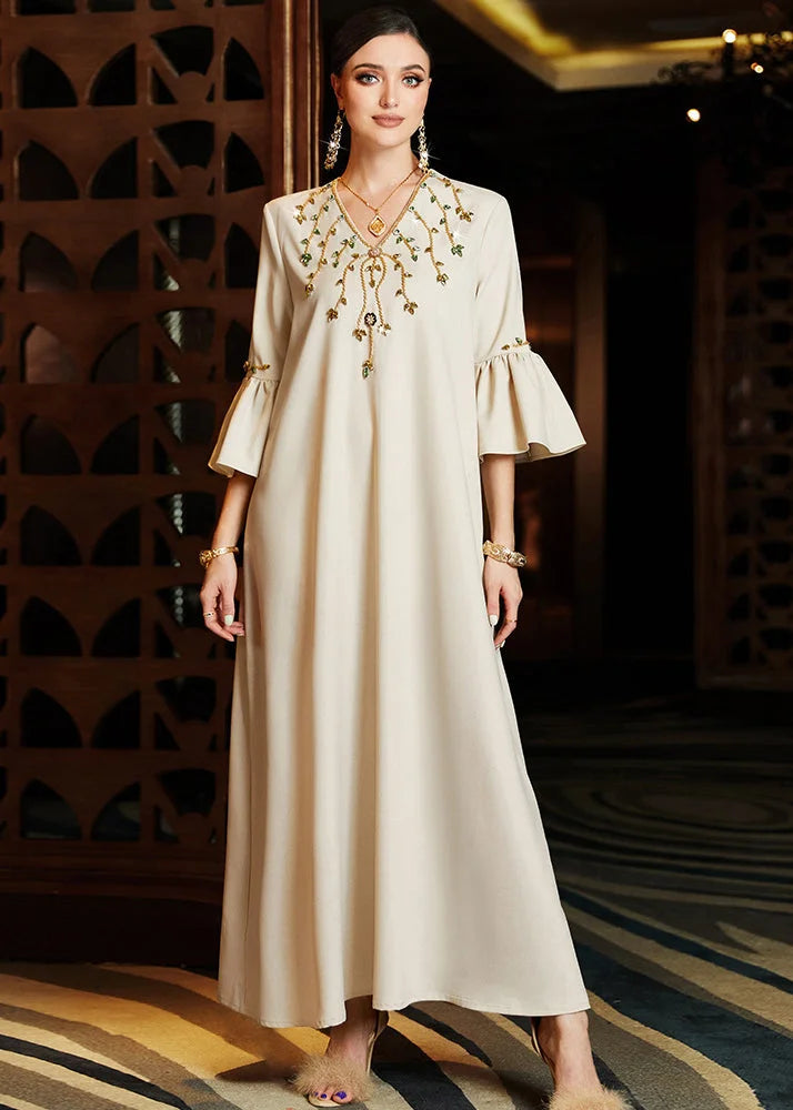 Questo abito lungo con ricami gioiello è la scelta perfetta per chi vuole distinguersi con eleganza e femminilità.