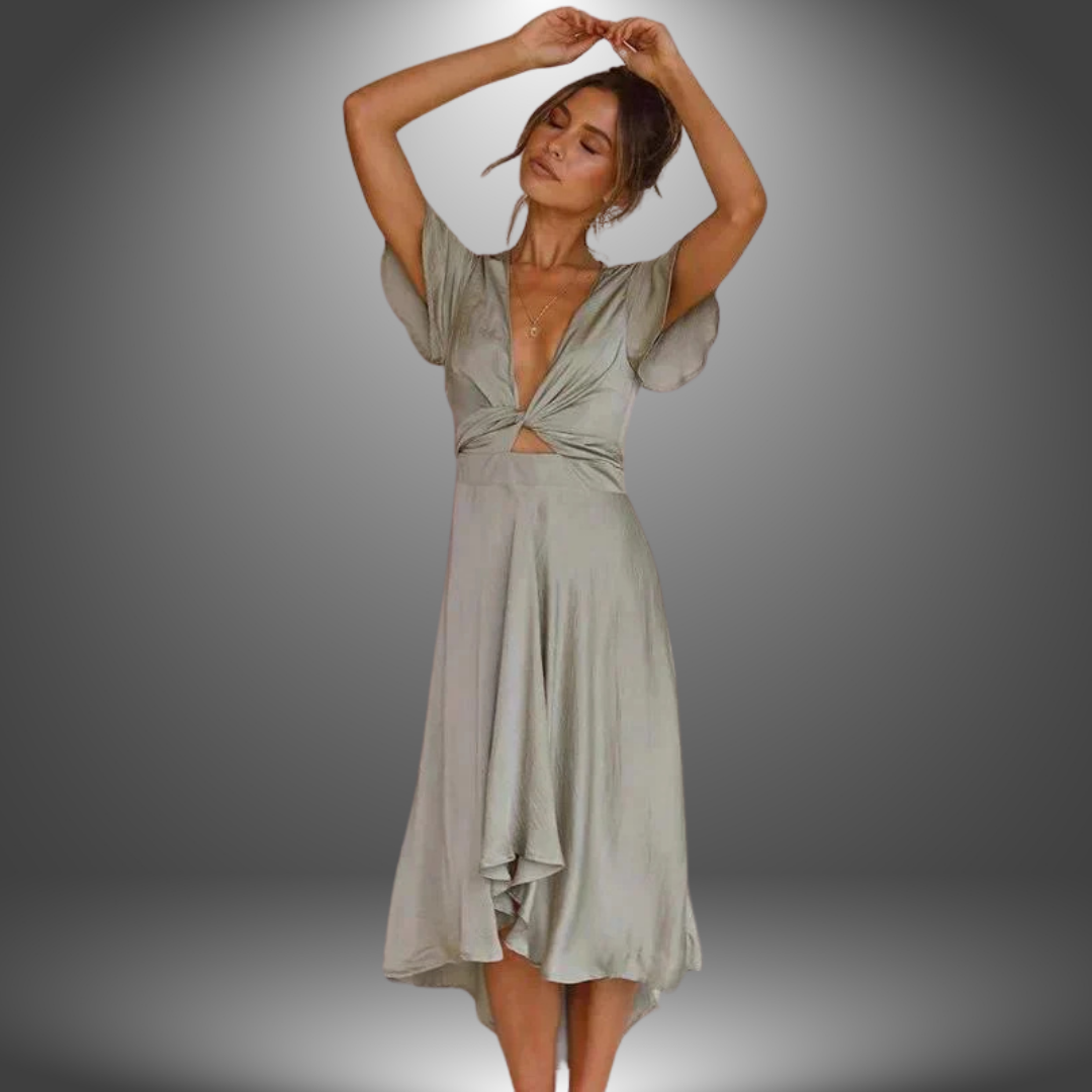 Questo abito con nodo frontale e spacco laterale unisce sensualità e raffinatezza in un design fluido e leggero.