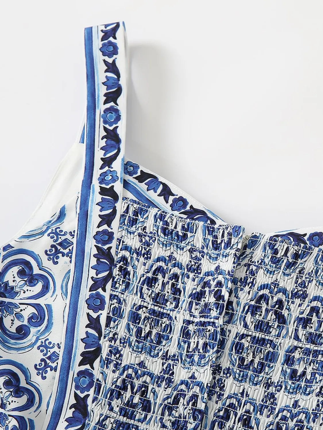 Questo abito lungo con stampa maiolica in stile mediterraneo unisce il fascino classico alla vivacità moderna.
