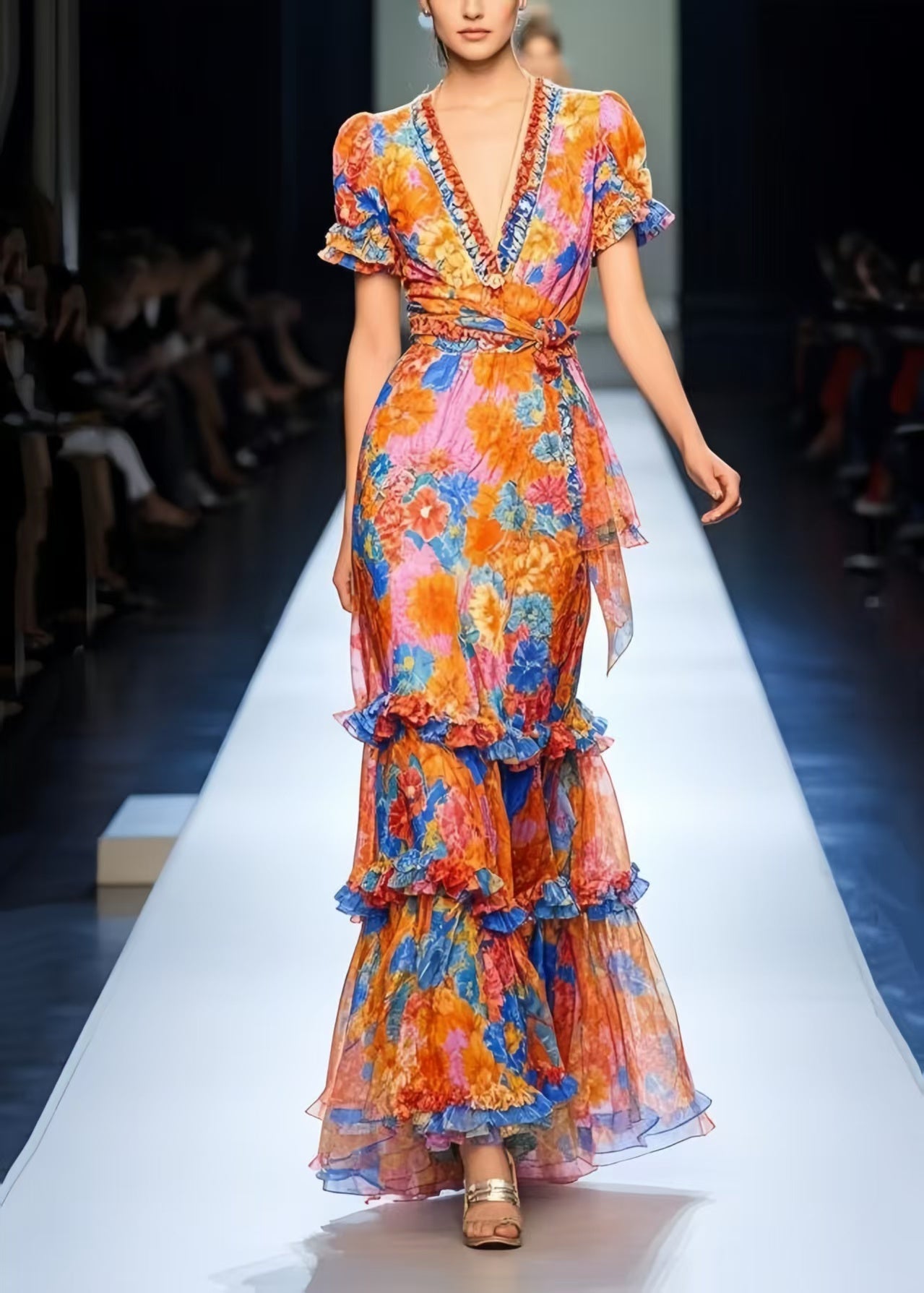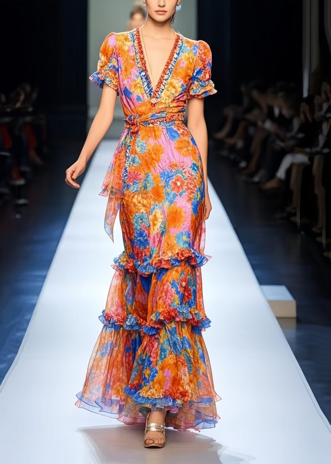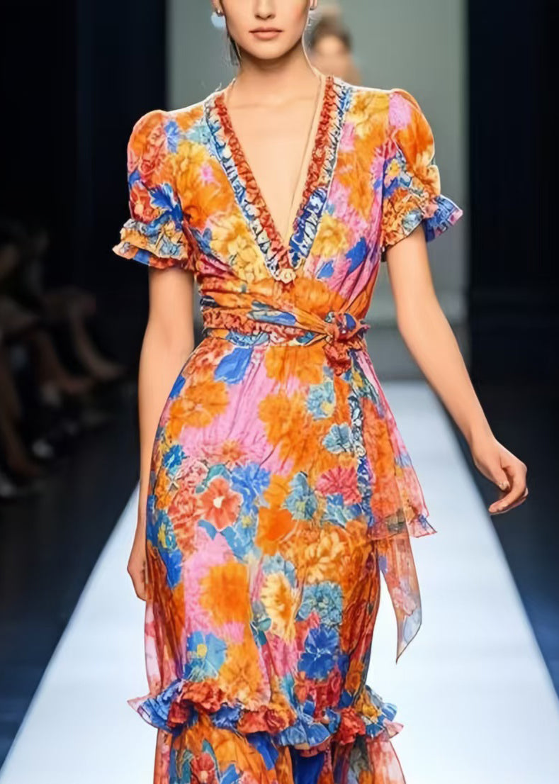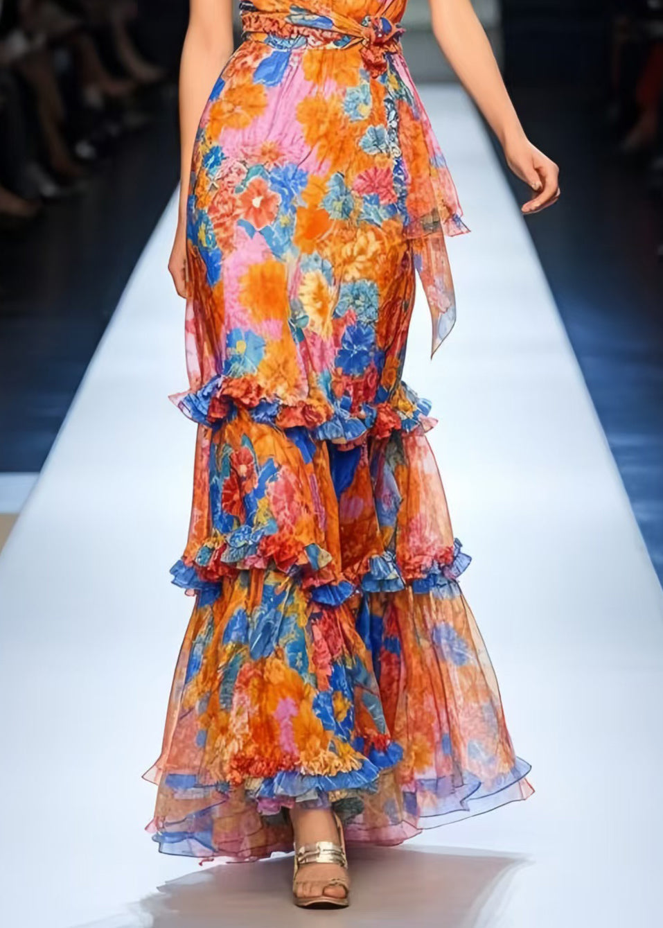 Questo abito lungo floreale a balze cattura lo sguardo con i suoi colori vivaci e il design romantico.