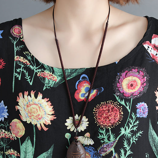 Questo vestito ampio con stampa floreale su fondo nero è un’esplosione di colore e freschezza.