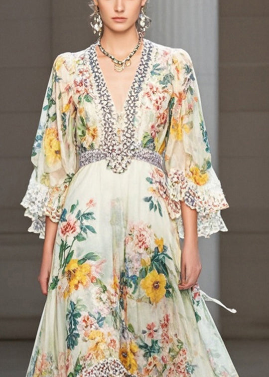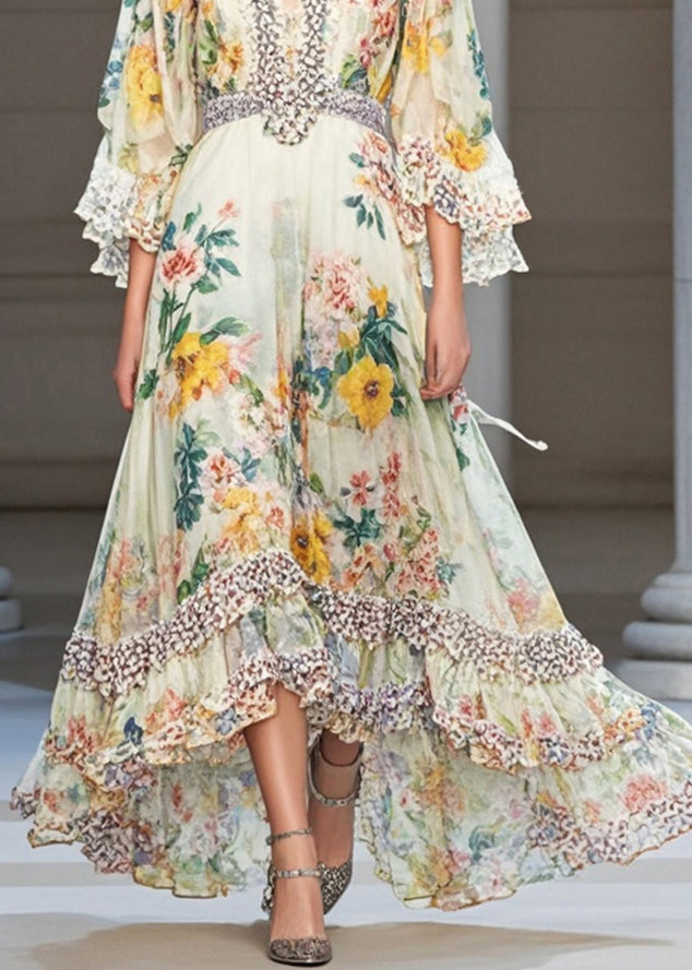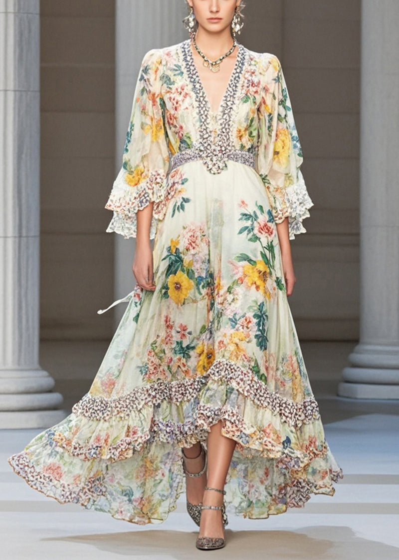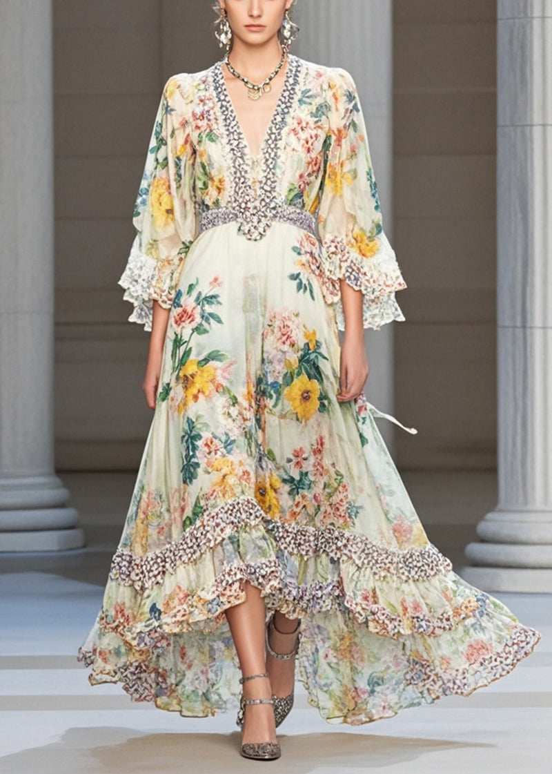 Questo vestito lungo a fiori con maniche a balza è perfetto per eventi eleganti, matrimoni estivi o feste in giardino.