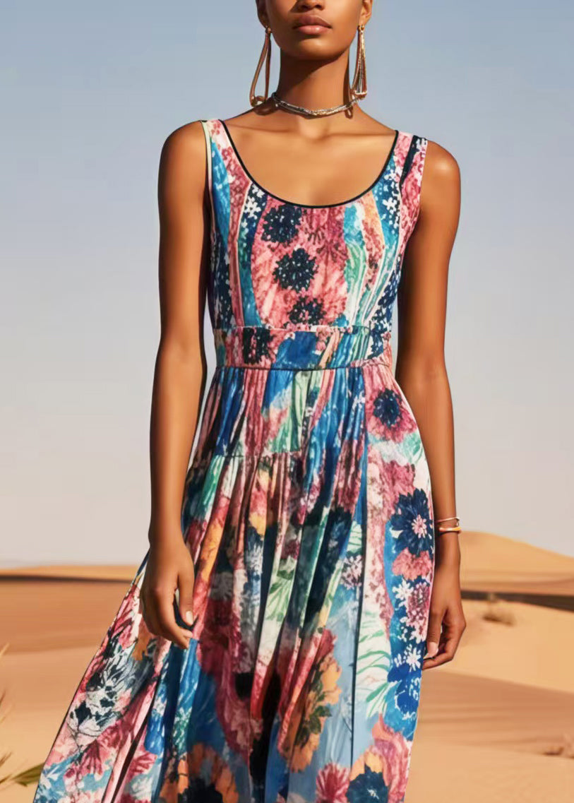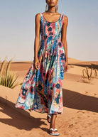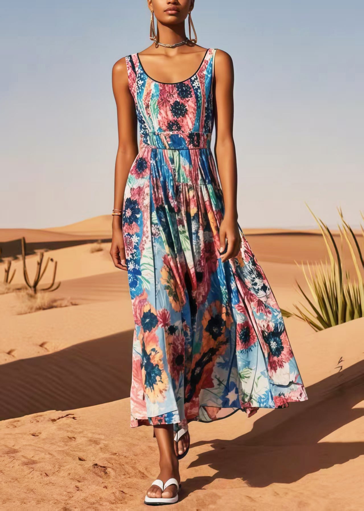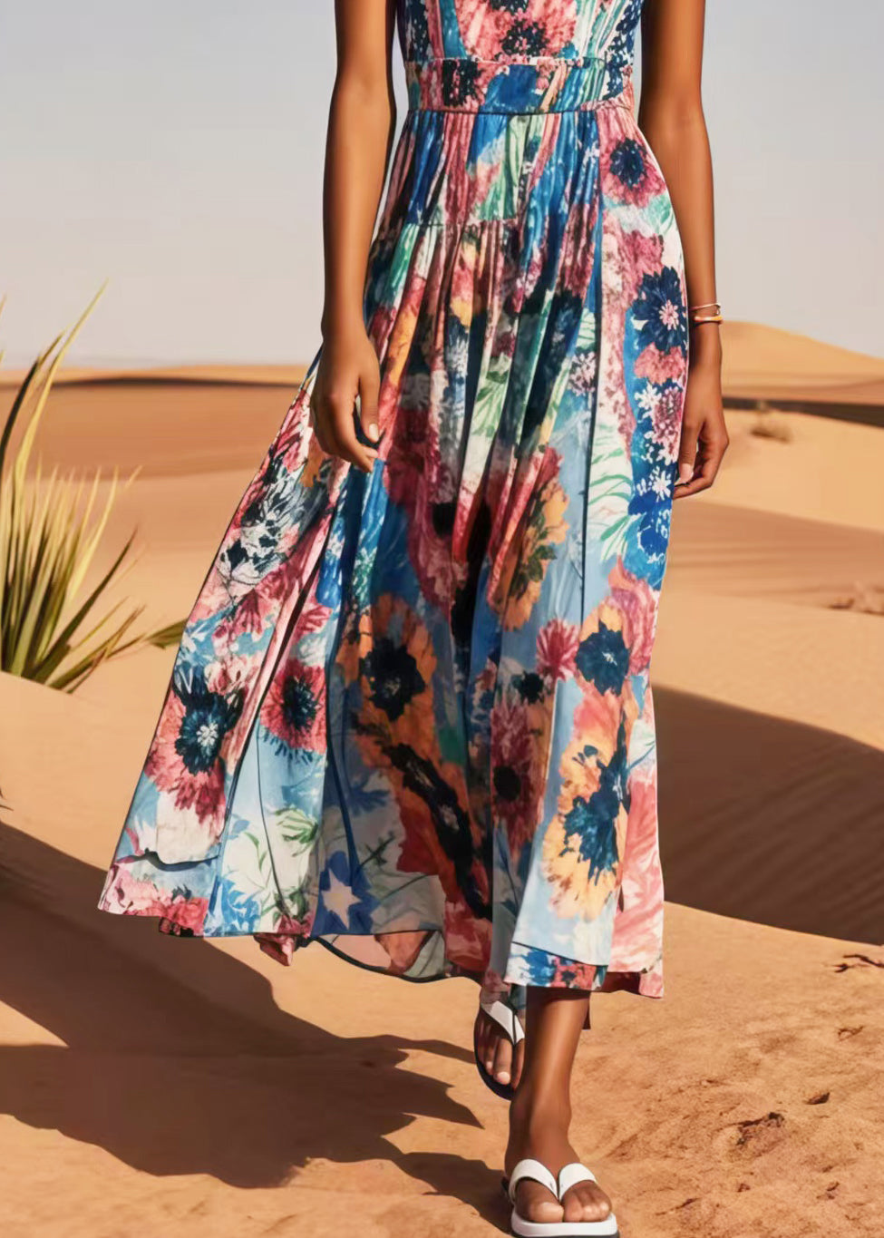 Questo maxi dress con stampa floreale colorata è leggero, fresco e perfetto per affrontare il caldo con stile.