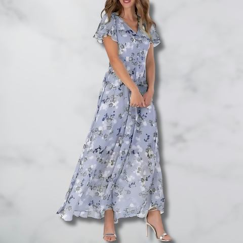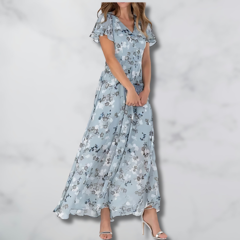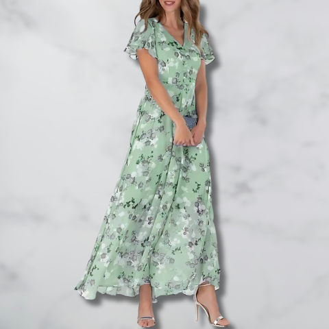 Questo abito lungo floreale è l’emblema della femminilità, con la sua silhouette leggera e romantica.