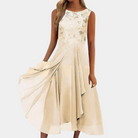 Questo abito svasato senza maniche presenta un raffinato corpetto ricamato e una gonna in chiffon fluida per un look sofisticato e senza tempo.