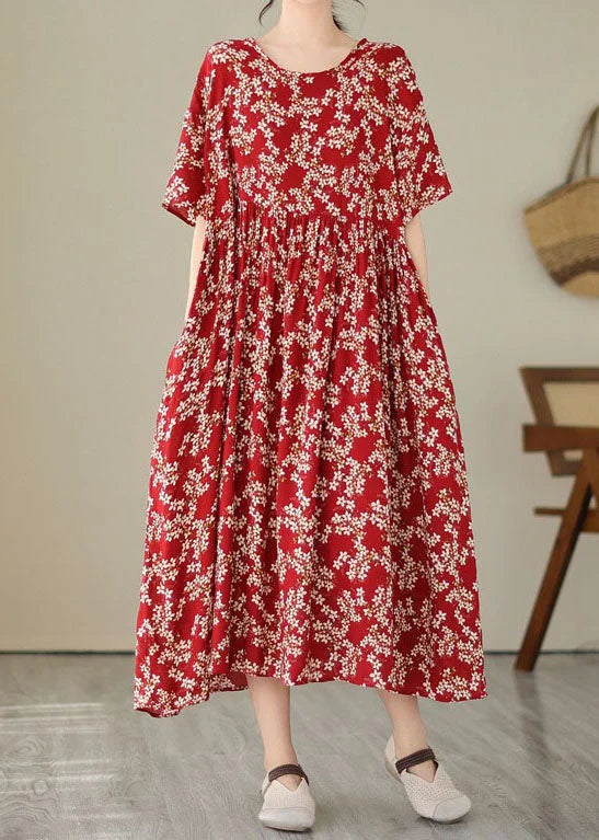 Questo abito ampio in cotone con stampa floreale su fondo rosso unisce freschezza, femminilità e praticità.