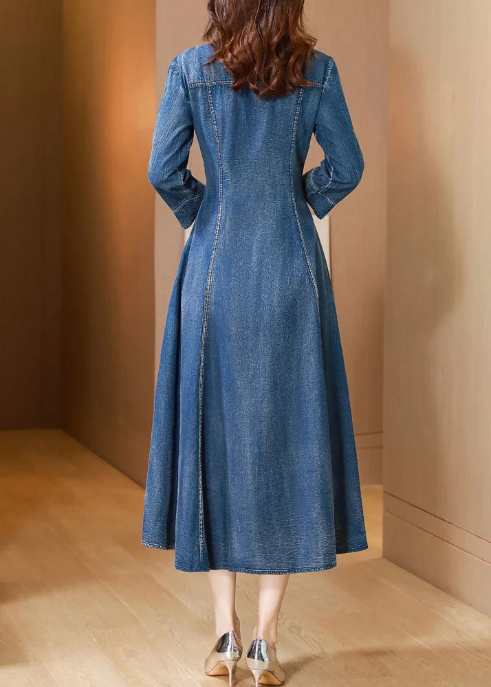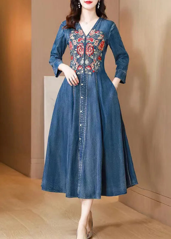 Questo vestito in denim con ricami floreali è perfetto per chi ama distinguersi con eleganza casual.