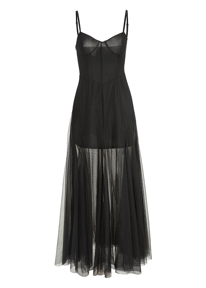 Questo vestito in tulle trasparente con spalline sottili è perfetto per creare sovrapposizioni eleganti e sensuali.
