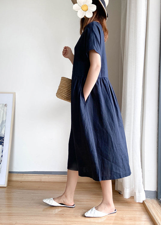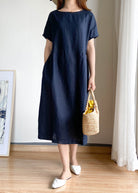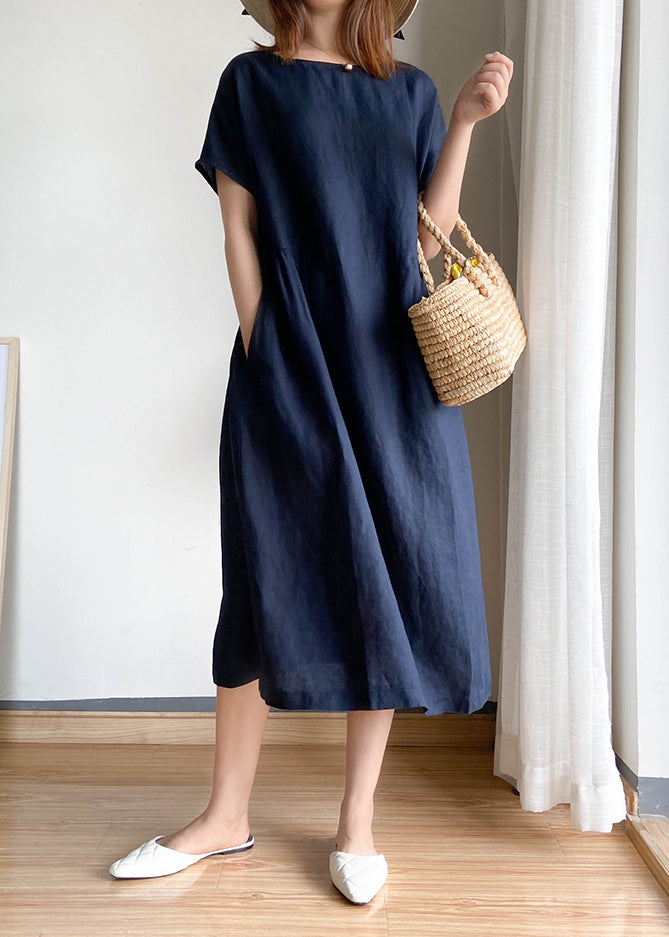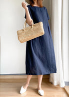 Questo abito midi in lino blu navy con taglio dritto è l’essenza della comodità minimalista.