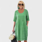 Questo abito in lino verde è la scelta ideale per un look naturale, leggero e senza tempo.