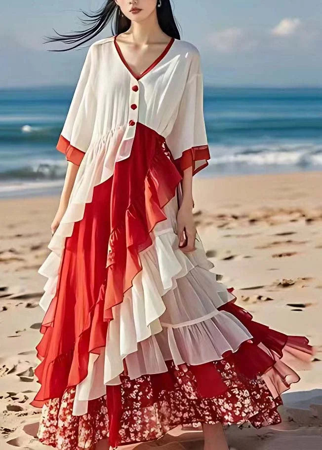 Questo abito lungo a balze, con dettagli asimmetrici e colori intensi, è perfetto per chi ama distinguersi con eleganza.