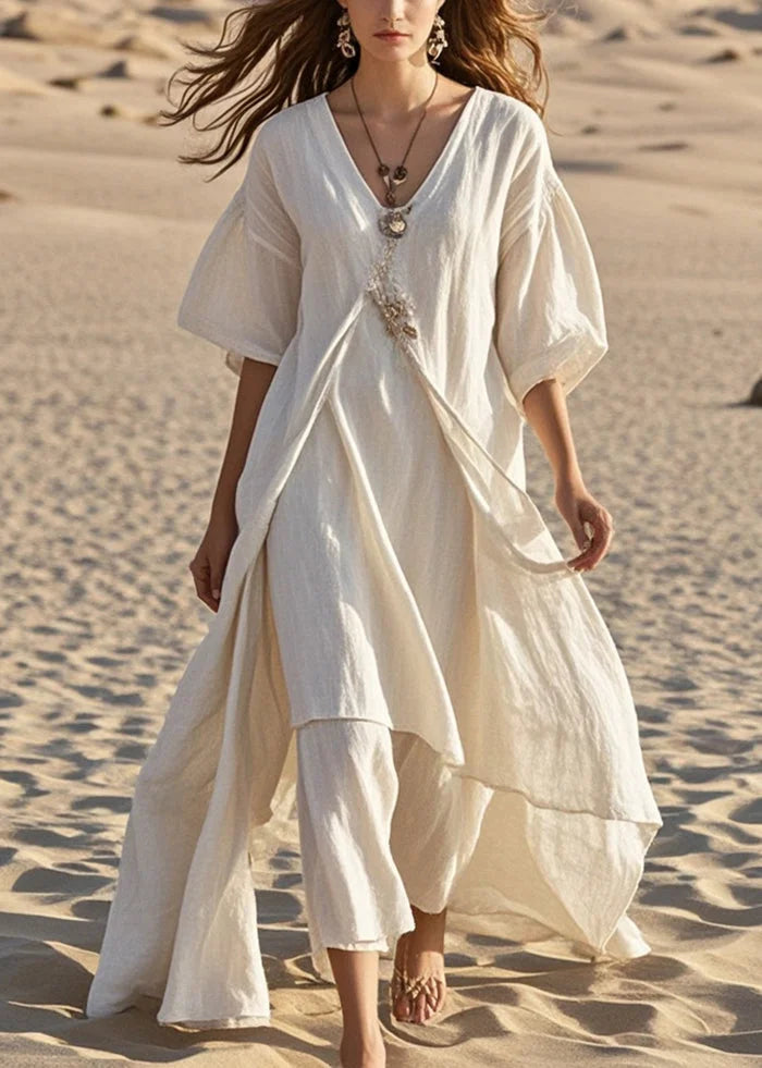 Questo abito lungo in lino, con strati fluidi e maniche ampie, offre comfort e fascino naturale.