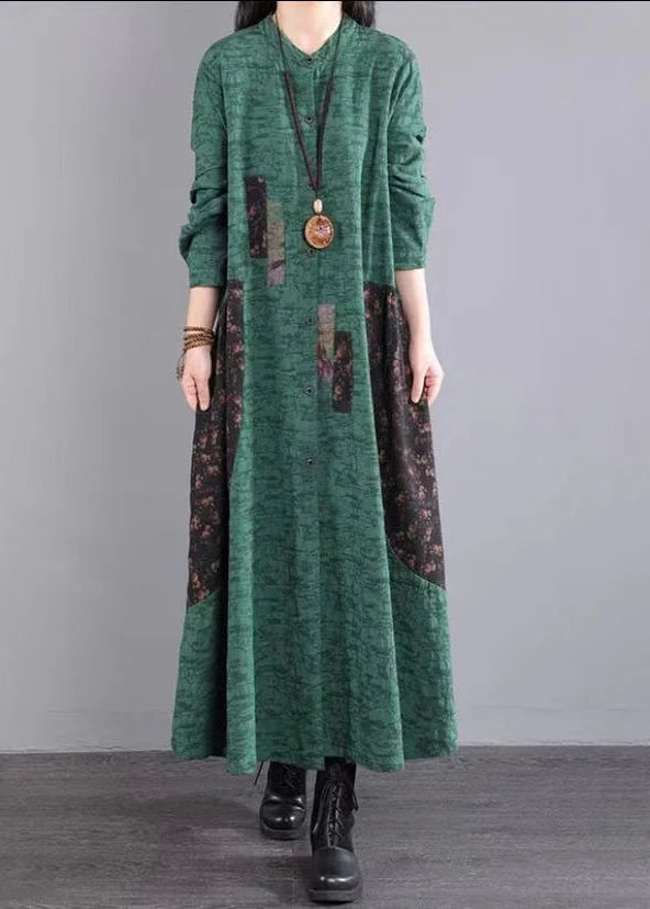 Questo vestito lungo unisce uno stile boho rilassato con dettagli floreali e patchwork unici.
