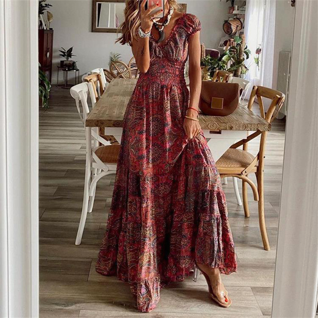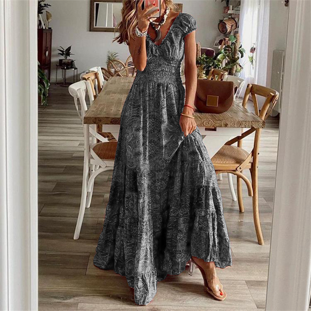 Questo abito lungo boho presenta una scollatura a V, maniche corte e una silhouette fluida che esalta la figura con eleganza. La stampa etnica e i dettagli raffinati lo rendono perfetto per vacanze, passeggiate e momenti speciali.