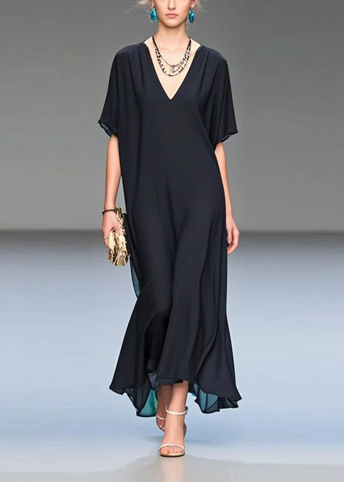La linea fluida e lo scollo a V creano un look intramontabile e chic.