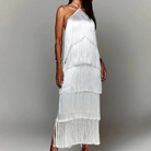 Questo abito lungo con frange e scollo all'americana è la scelta perfetta per chi ama lo stile vintage e sofisticato.