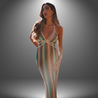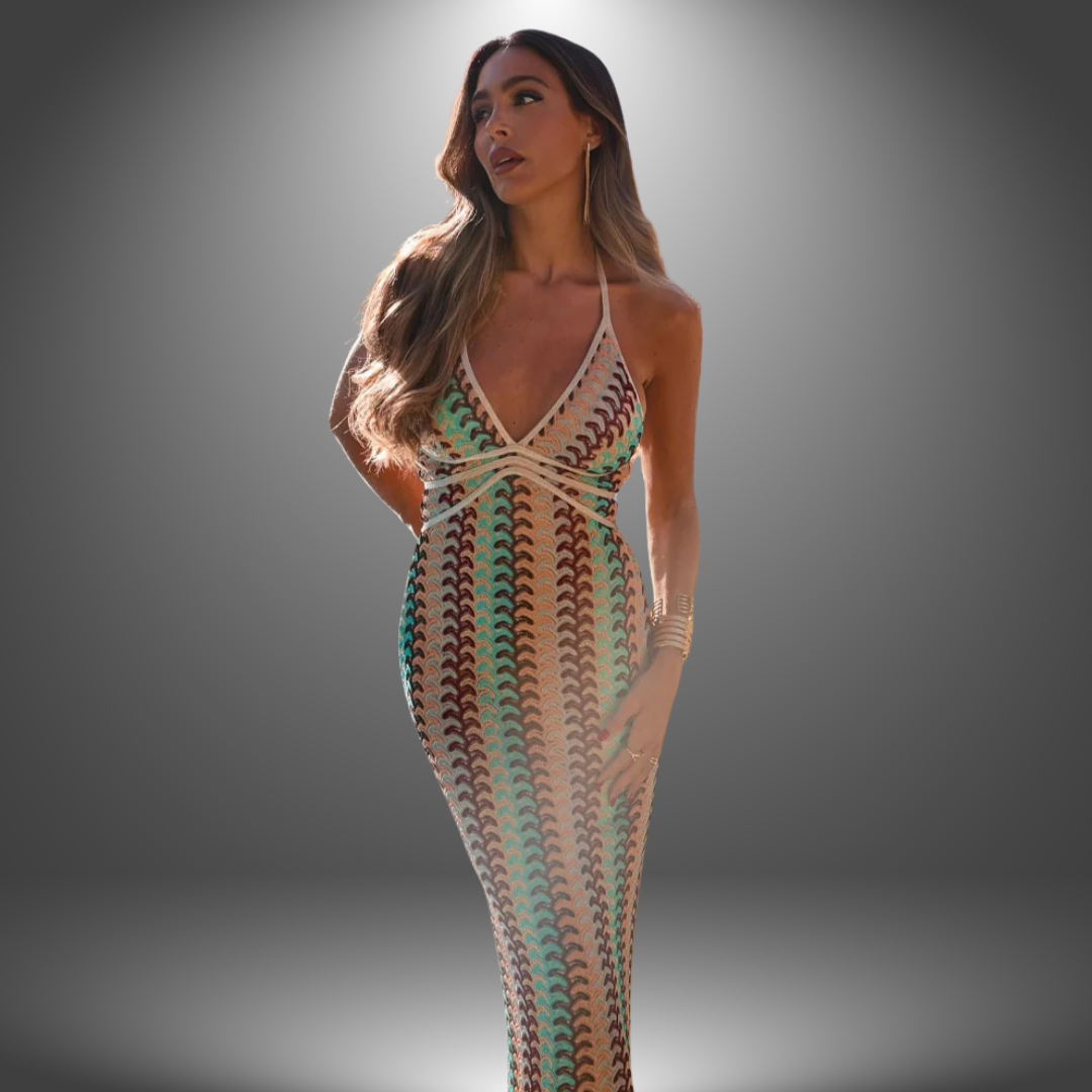 Questo abito lungo con spalline sottili e fantasia a onde multicolore è un mix di glamour e leggerezza.