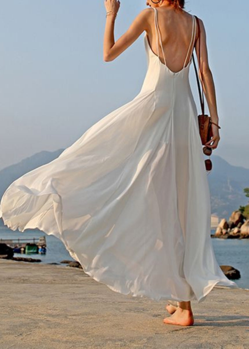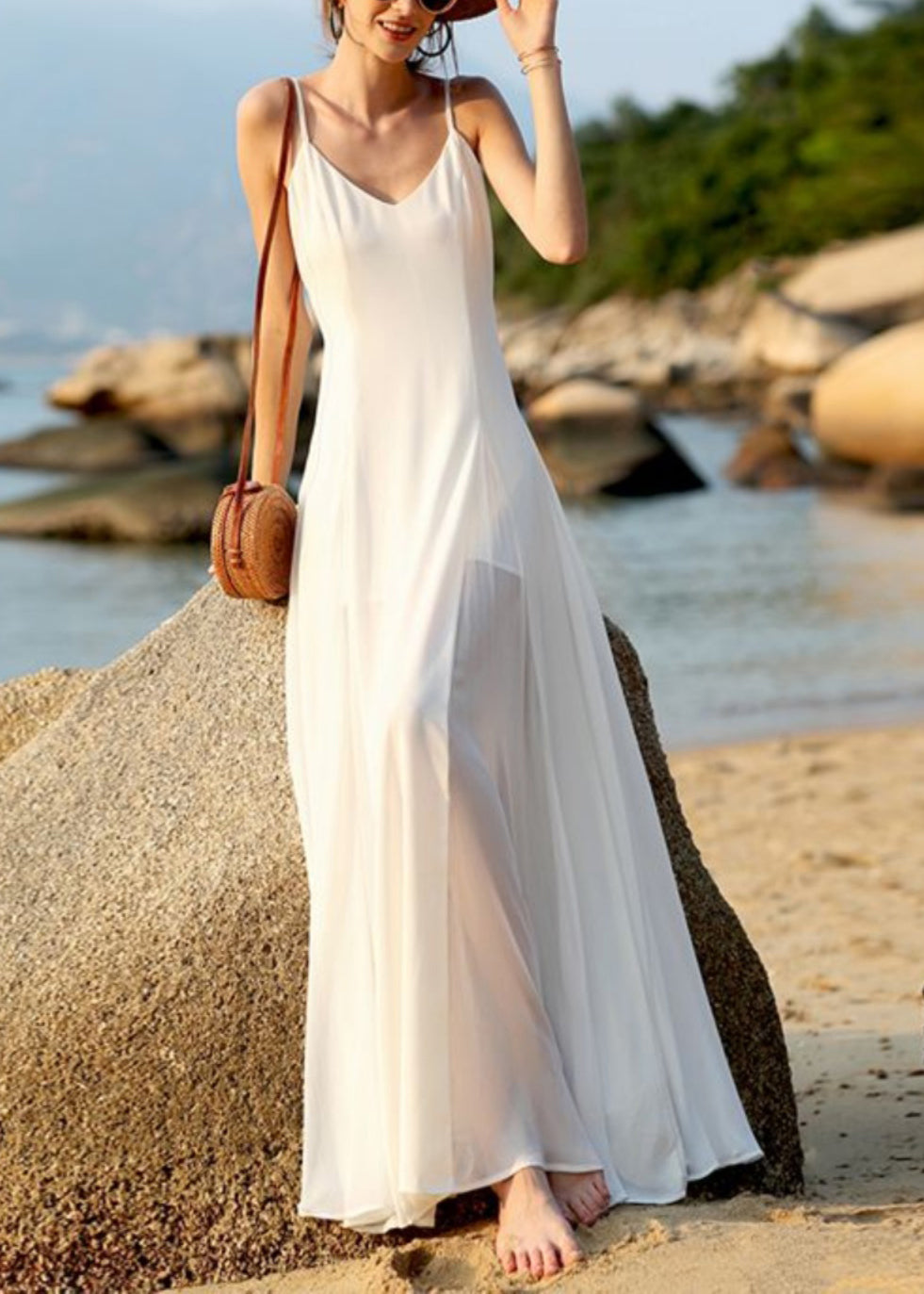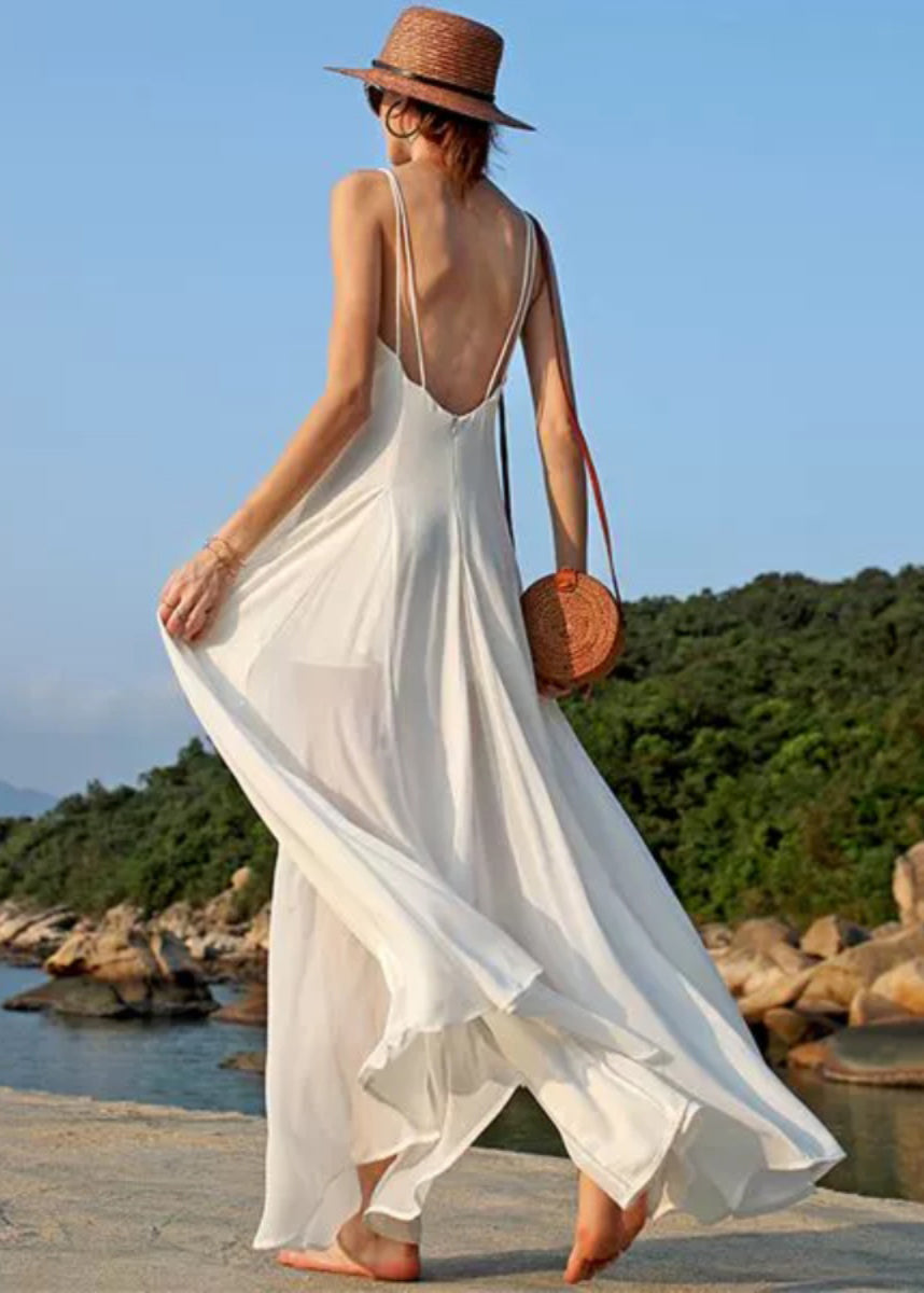 Questo vestito lungo e leggero con spalline sottili è la scelta ideale per chi desidera freschezza e femminilità.