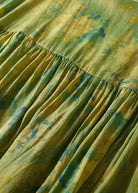 Questo abito lungo verde con stampa effetto acquerello offre una vestibilità ariosa e un’estetica naturale dal fascino bohémien.