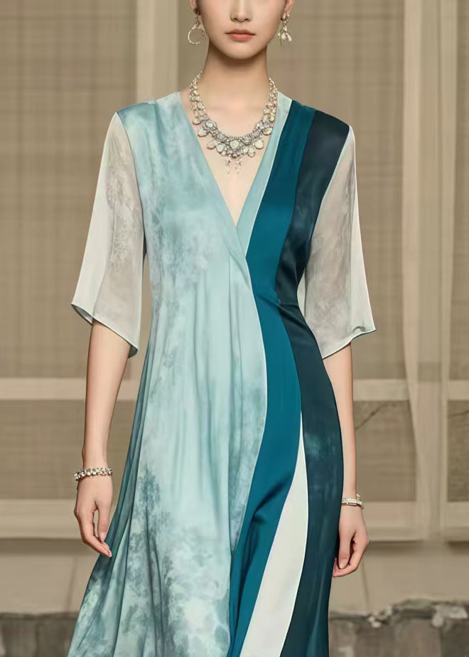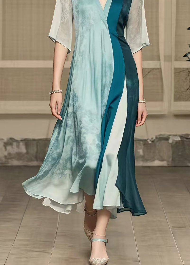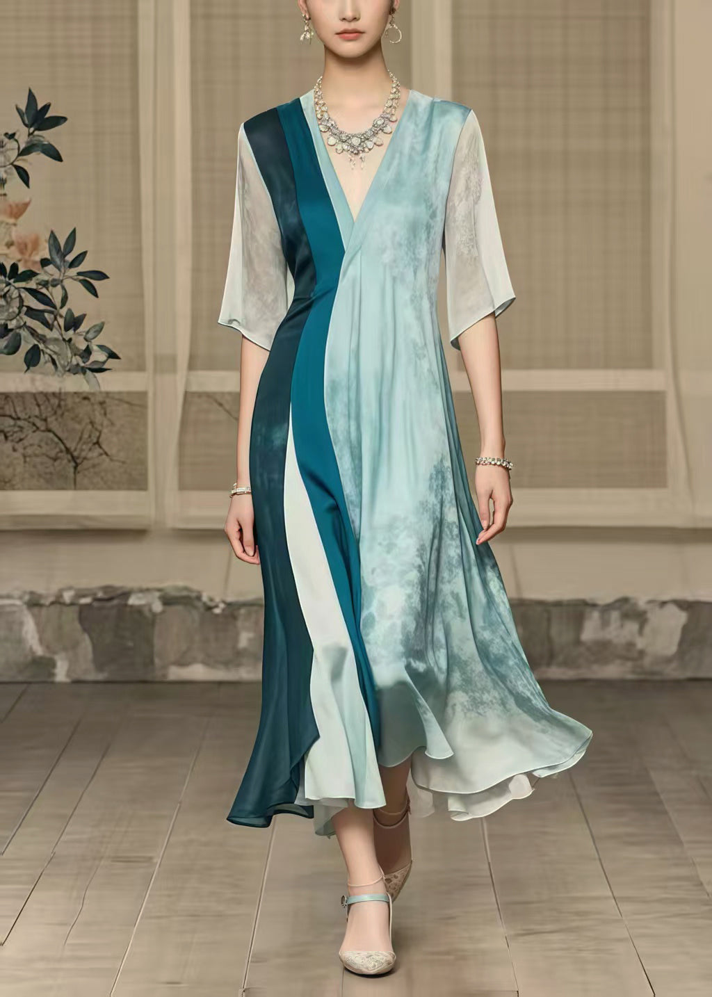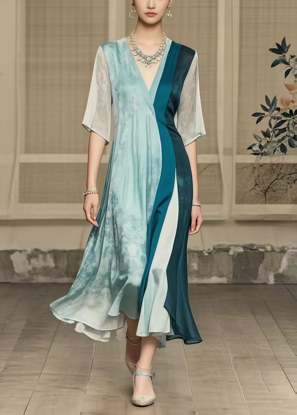 Questo abito lungo con scollo a V e maniche a tre quarti è un capolavoro di stile e fluidità, perfetto per eventi formali o speciali.