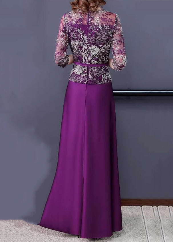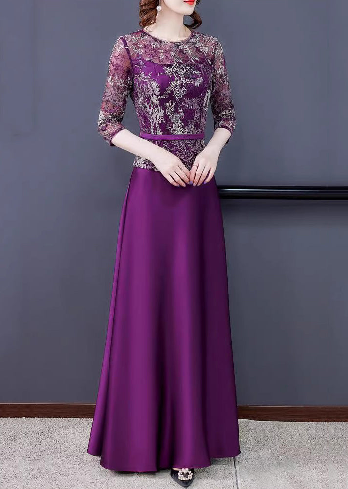 Questo vestito lungo con corpetto in pizzo floreale e maniche a tre quarti unisce romanticismo e classe.