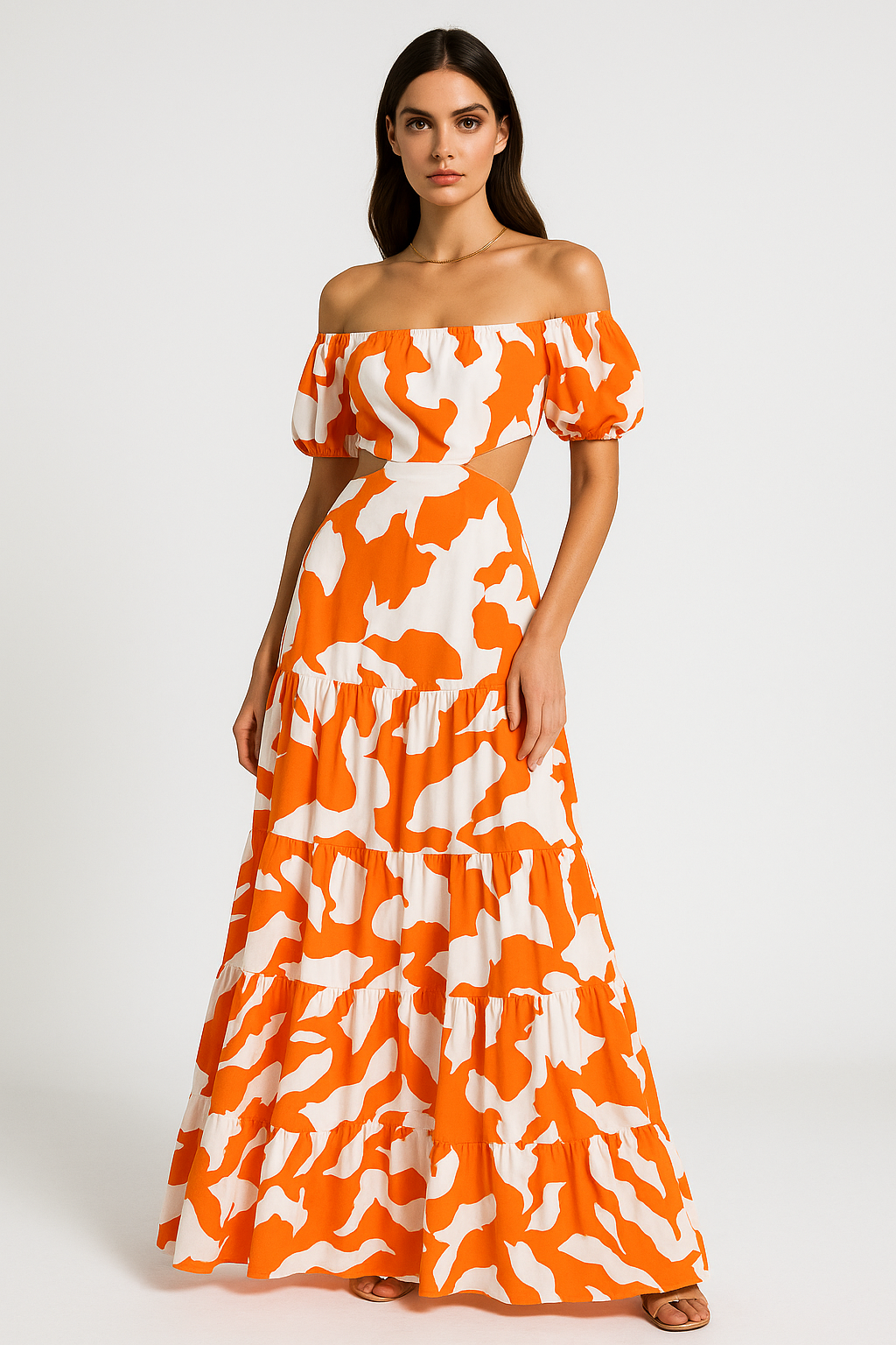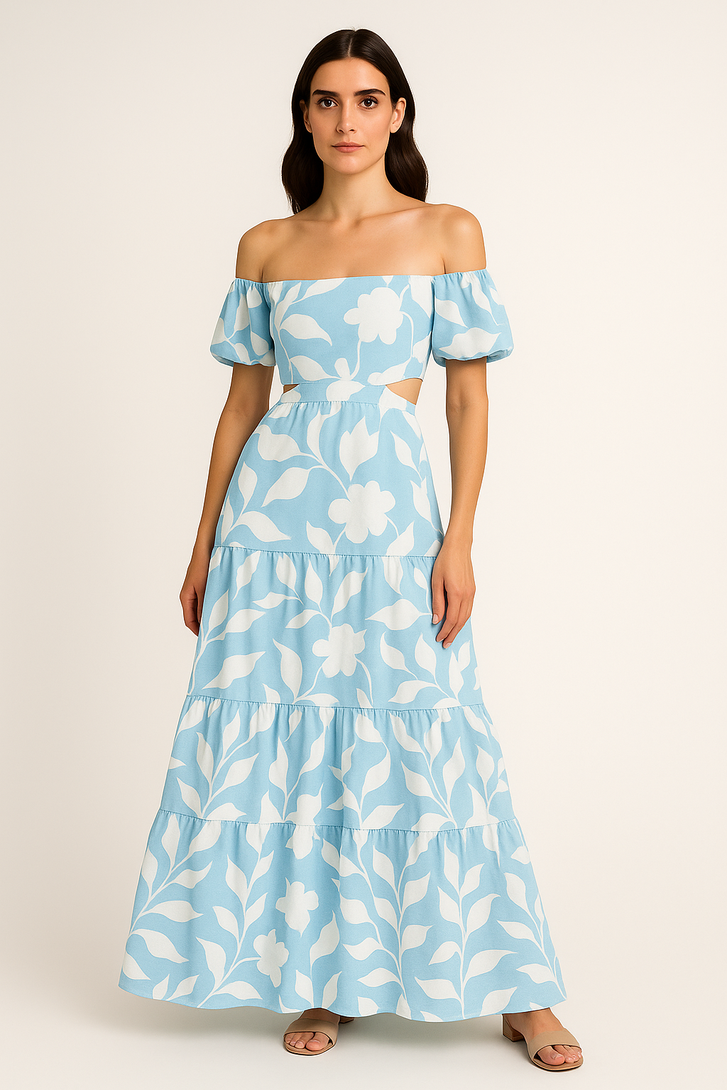 Questo abito lungo off-shoulder unisce sensualità e freschezza grazie al taglio svasato, le aperture laterali in vita e la stampa vivace. Il design con spalle scoperte e maniche corte a sbuffo lo rende l’alleato ideale per distinguersi con stile in ogni occasione estiva.