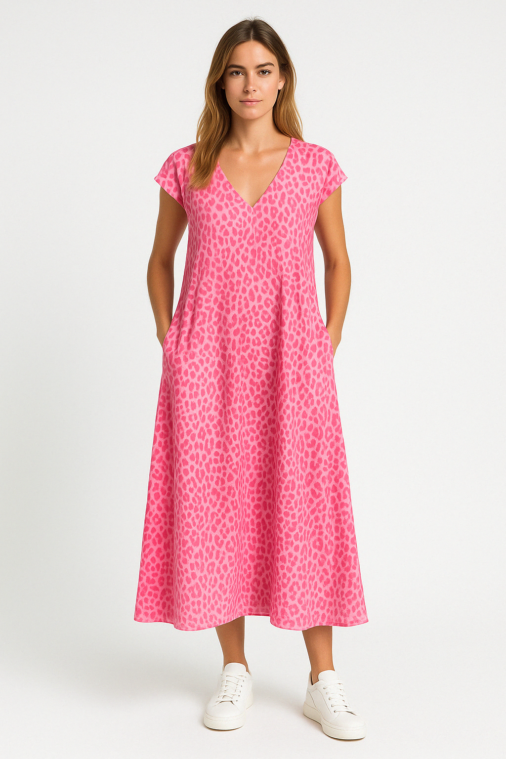 Il nostro abito lungo con stampa leopardata è la scelta ideale per un look audace e di tendenza. La scollatura a V e le maniche corte donano un tocco femminile e rilassato, perfetto per passeggiate in città o giornate al mare.
