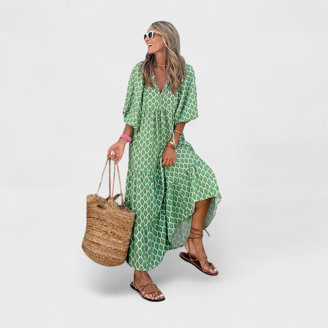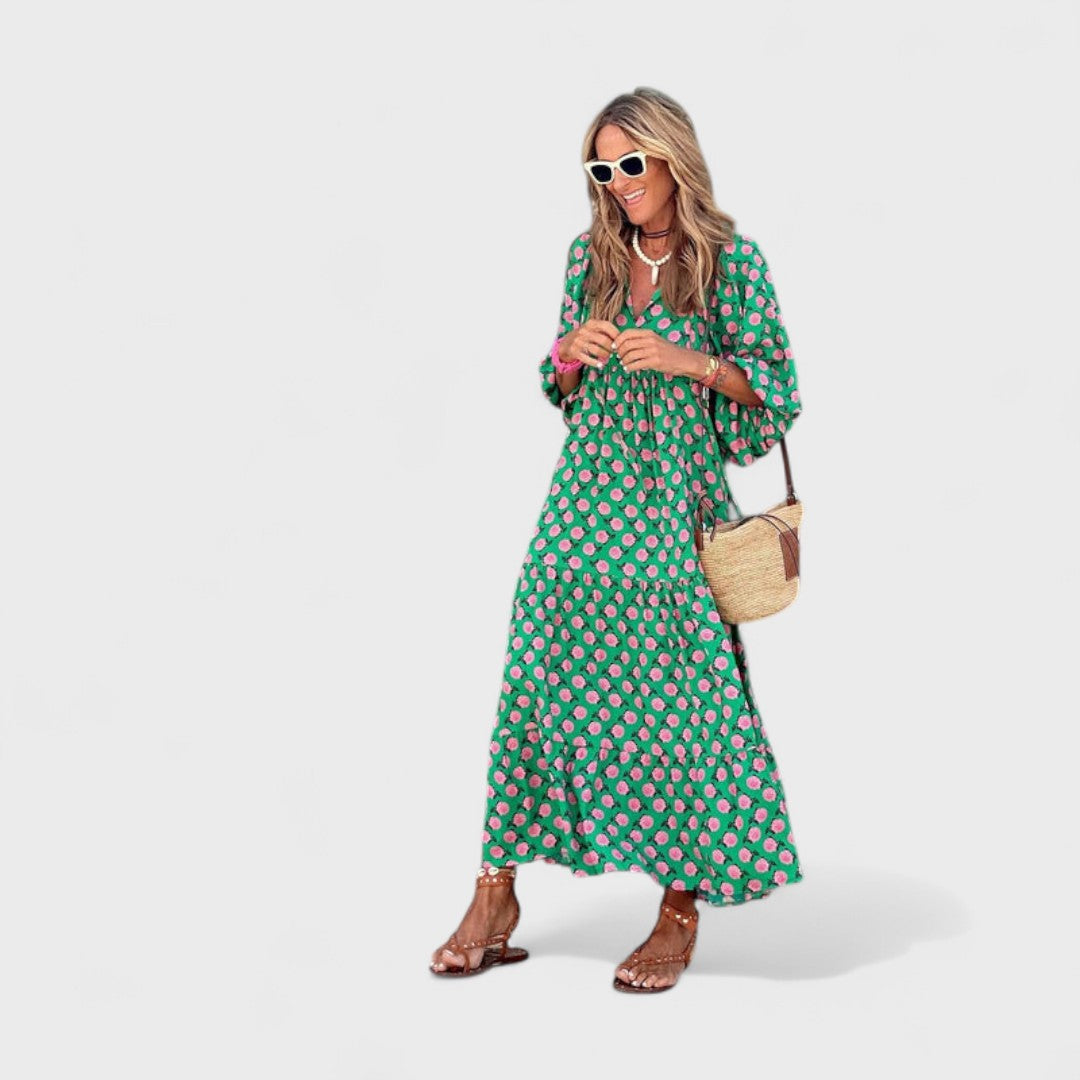 Questo abito lungo con fantasia floreale è un’esplosione di colore, leggerezza e stile.