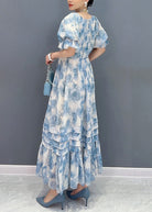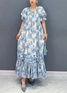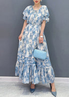 Questo vestito lungo con stampa floreale azzurra e maniche a balze è la scelta perfetta per un look raffinato e leggero.