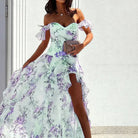 Questo abito lungo floreale con spacco laterale è la scelta ideale per un look elegante e arioso. Le spalle scoperte e la silhouette fluida aggiungono un tocco di femminilità, rendendolo perfetto per cerimonie, feste estive o passeggiate romantiche al tramonto.