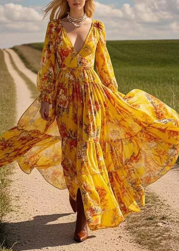 Questo abito lungo a fiori sprigiona energia e femminilità, ideale per eventi speciali o passeggiate romantiche.