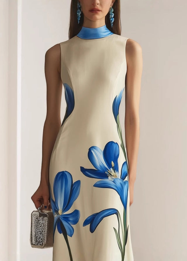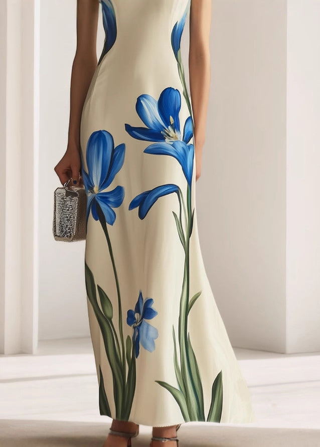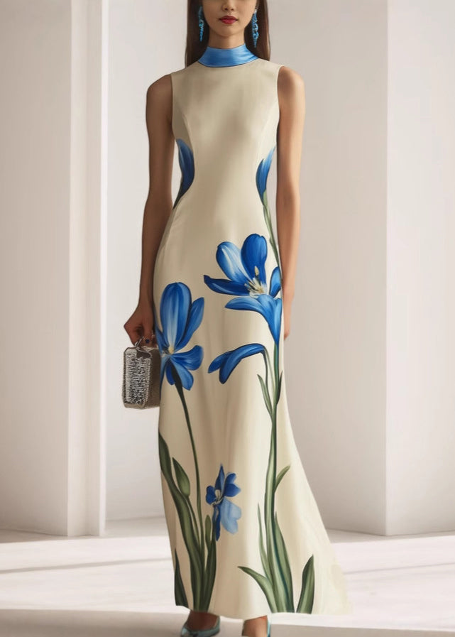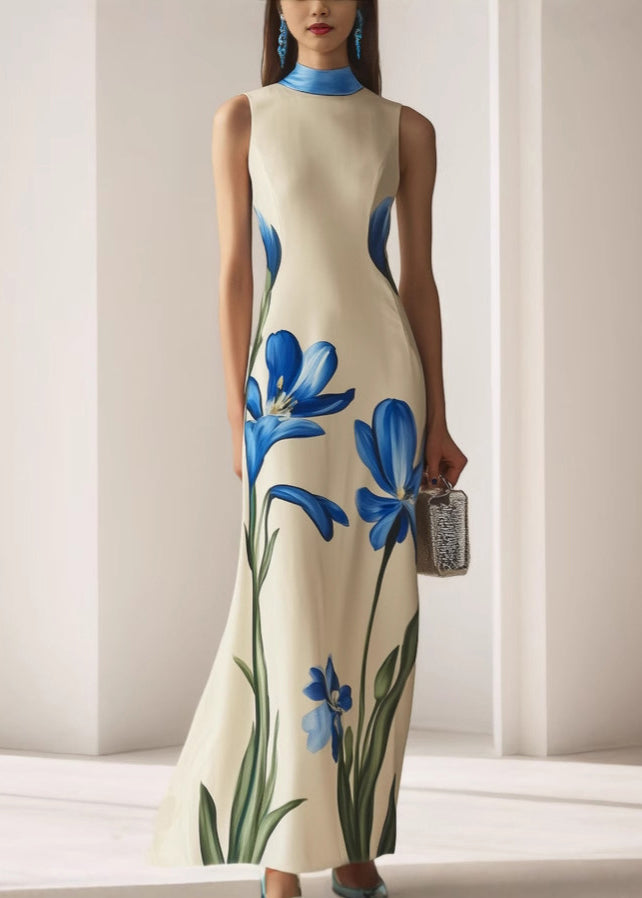 Questo abito lungo senza maniche affascina con la sua linea pulita e la stampa floreale blu in stile artistico.