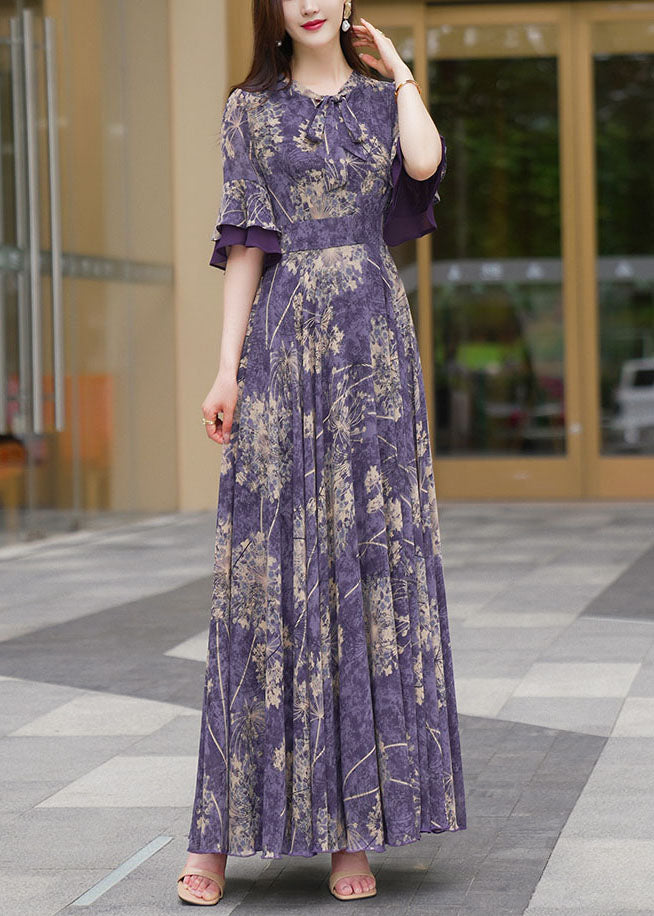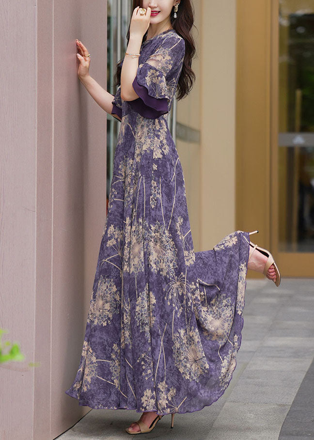 Questo abito lungo in chiffon con stampa floreale e maniche con balze è un capolavoro di grazia ed eleganza.